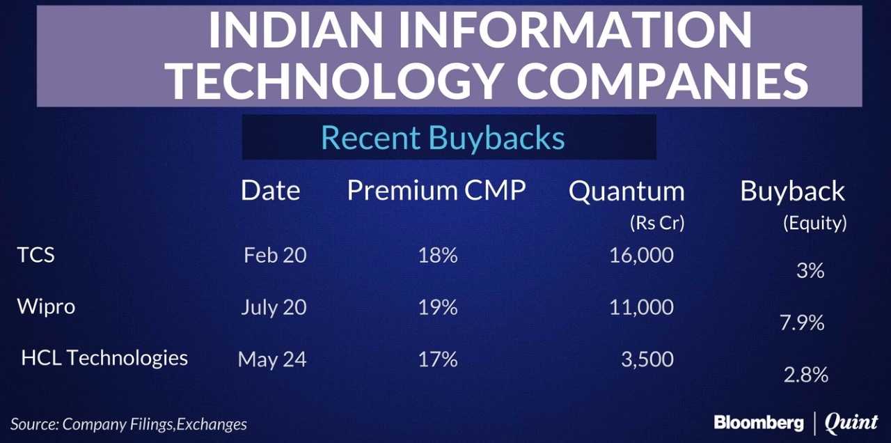 - In May, HCL Technologies said it would buy back shares worth Rs 3,500 crore – or about 2.8 percent of its equity at a 17 percent premium to the prevailing market price.