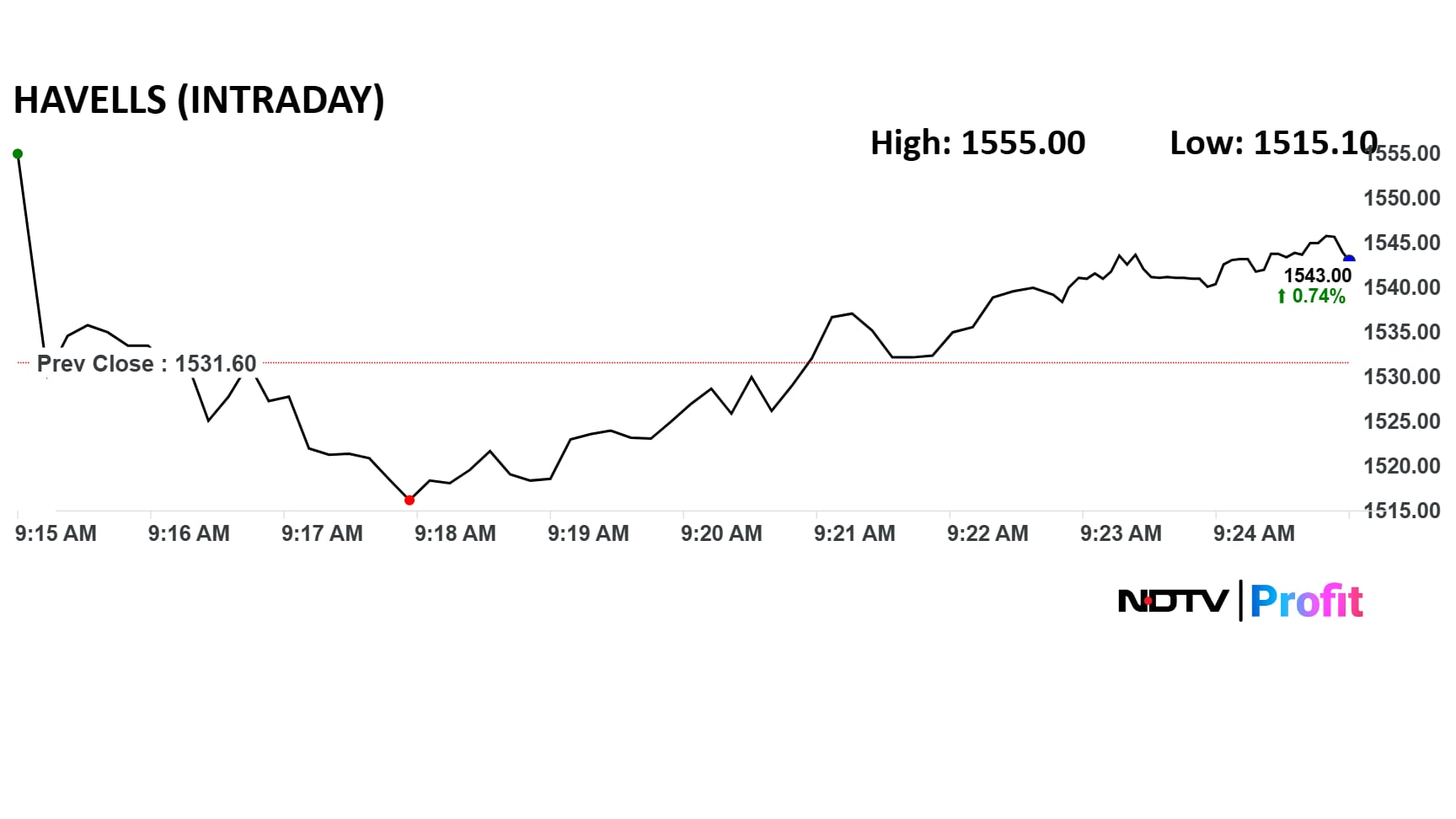 Havells India shares swung between gains and losses in the first few minutes of trade. It was trading 0.7% higher as of 9:25 a.m. The benchmark NSE Nifty 50 was up 0.16%.