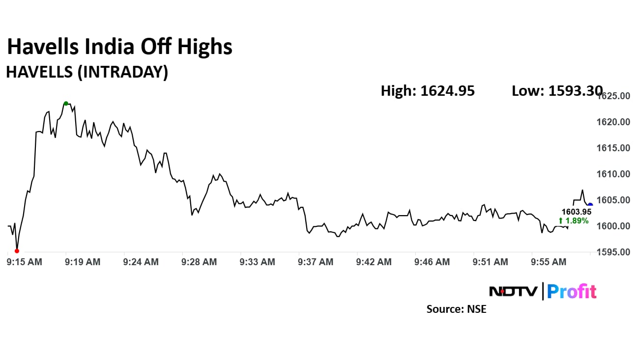 Havells India share price rose 3.23% to Rs 1,624.15 apiece. It pared gains to trade 1.60% higher at Rs 1,599.45 apiece as of 10:11 a.m., as compared to 0.08% advance in the NSE Nifty 50.