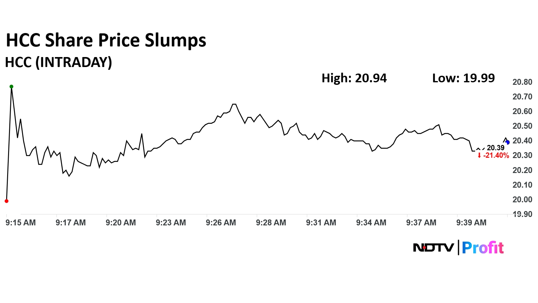 HCC share price slumped 22.94% to Rs 19.99 apiece, the lowest level since Aug 9, 2023. It was trading 20.18% down at Rs 20.71 apiece as of 10:23 a.m., which implies 0.24% advance in the NSE Nifty 50 index.
