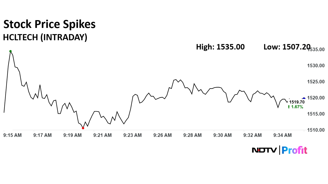 HCLTech Ltd.'s share price rose nearly 3% on Tuesday after the company reported a 5.2% year-on-year increase in revenue, reaching Rs 31,942 crore, slightly above the estimated Rs 31,472 crore. Net profit rose 10% to Rs 4,235 crore, nearly matching the projected Rs 4,236 crore.