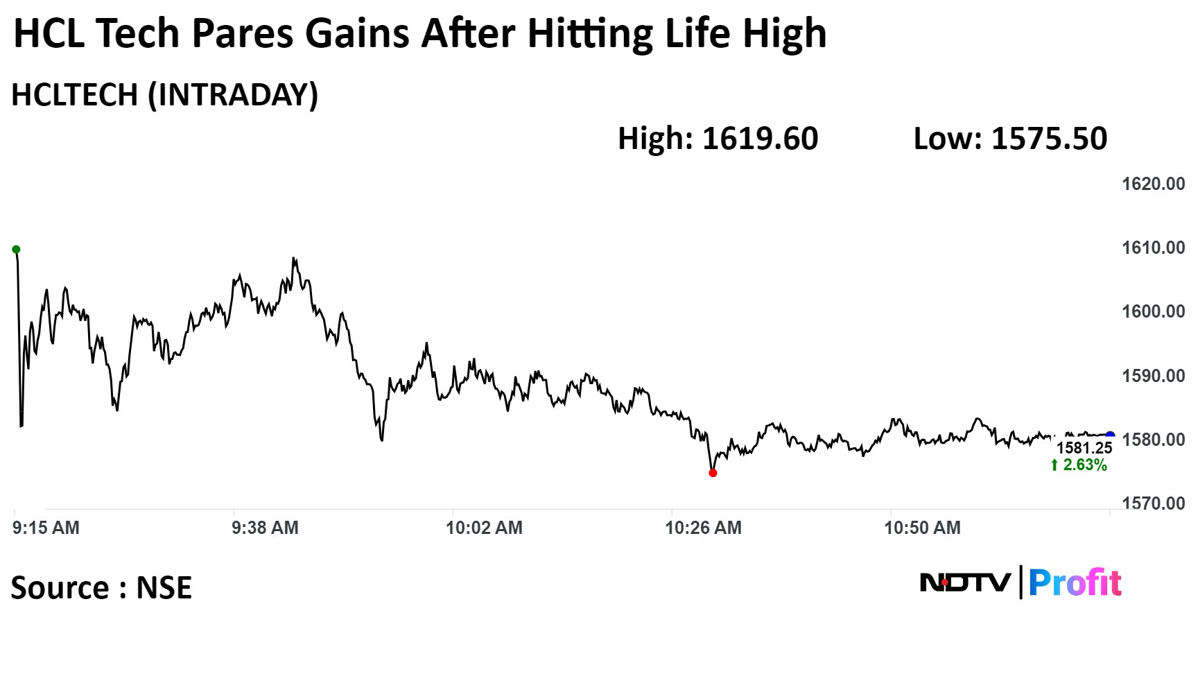 HCLTech's stock rose as much as 5.11% during the day to Rs 1,619.60 apiece on the NSE. It was trading 2.55% higher at Rs 1,580.15 per share, compared to a 0.7% advance in the benchmark Nifty 50 as of 11:16 a.m.