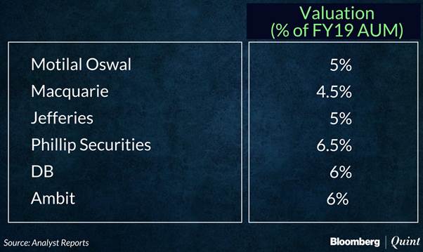 Analysts have valued HDFC AMC at about 5-6 percent of its estimated assets under management for the financial year 2018-19. This is higher than Reliance Nippon Life AMC's valuation, which currently trades at around 4.2 percent of AUM.