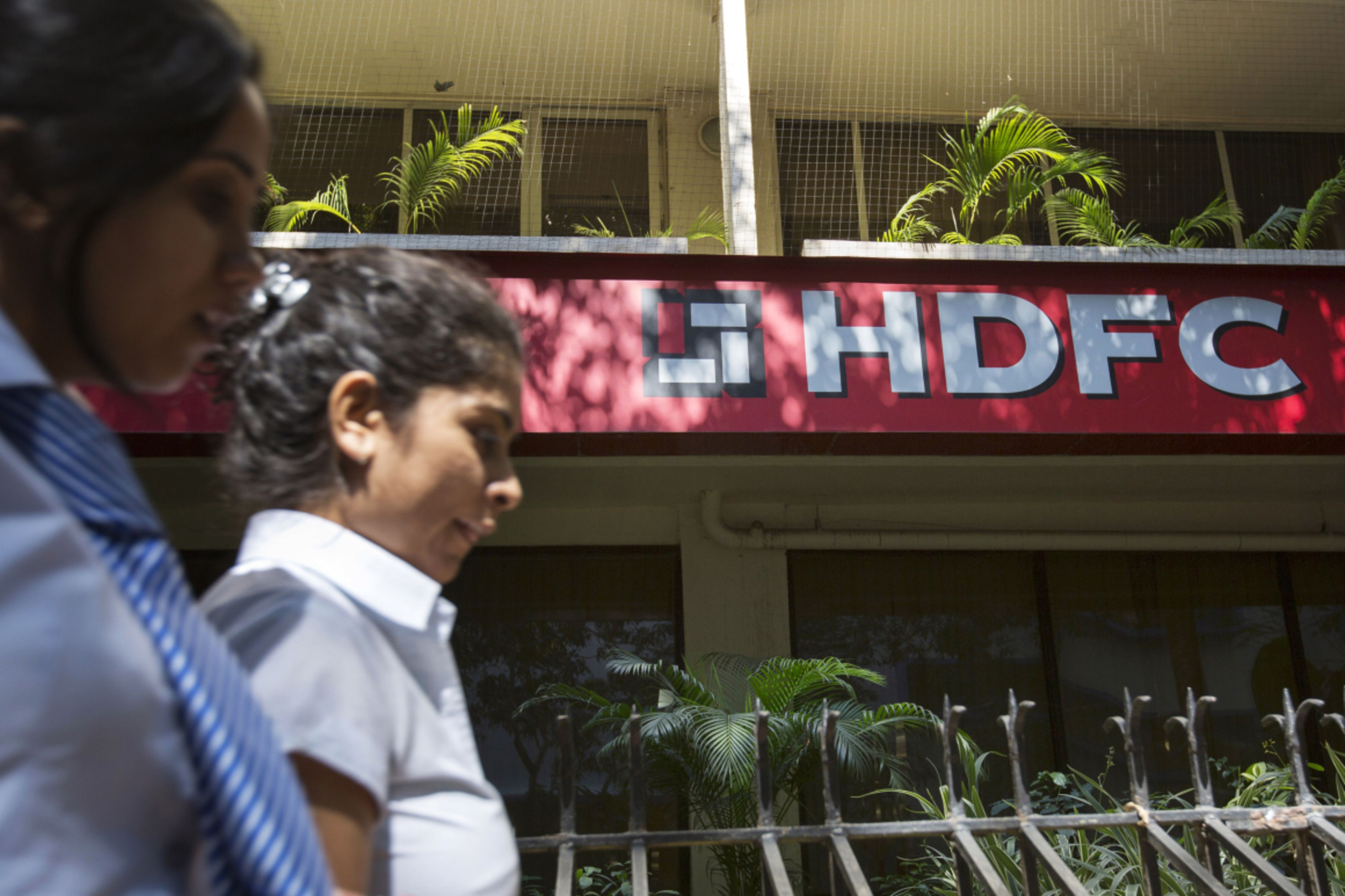 Pedestrians walks past signage for Housing Development Finance Corp. (HDFC) outside the company’s offices in Mumbai, India. (Photographer: Vivek Prakash/Bloomberg)