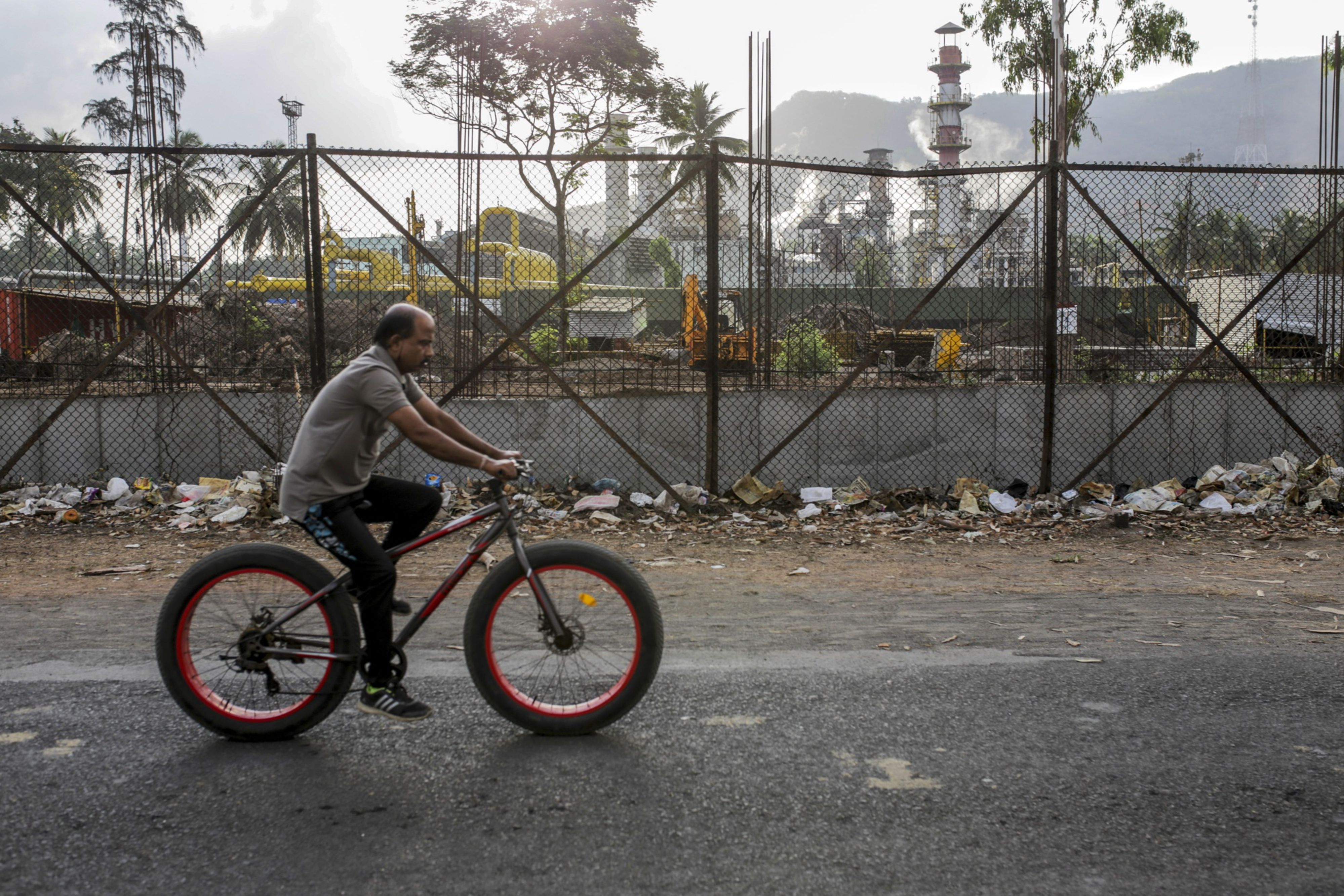 A man cycles past ONGC’s Uran plant in Maharashtra. (Photographer: Dhiraj Singh/Bloomberg)