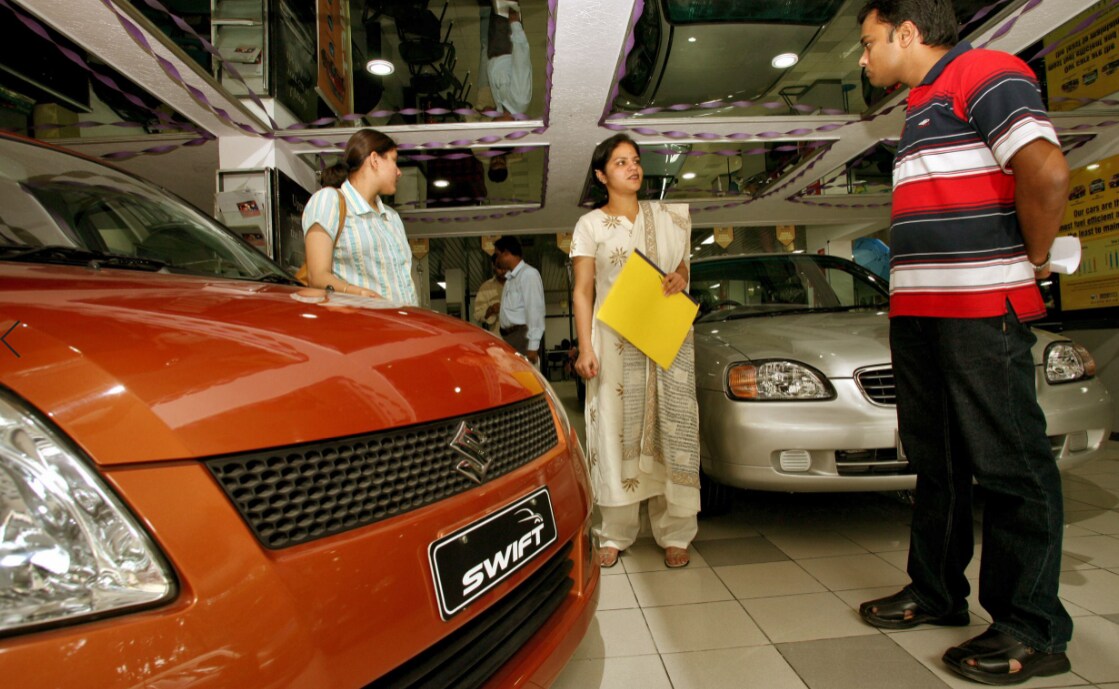 A couple look at Suzuki-Maruti cars at at a showroom in Bangalore (Photographer Namas Bhojani/Bloomberg)