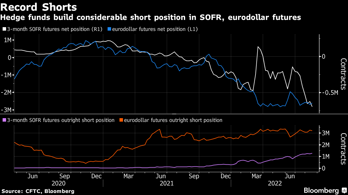 Meanwhile in eurodollar futures, short wagers from hedge funds are near this year's highest levels at just over 2.6 million contracts, on a net basis.