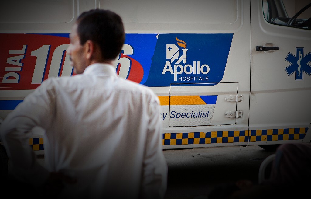 The Apollo Hospitals Enterprise Ltd. logo is displayed on an ambulance. (Photographer: Prashanth Vishwanathan/Bloomberg)