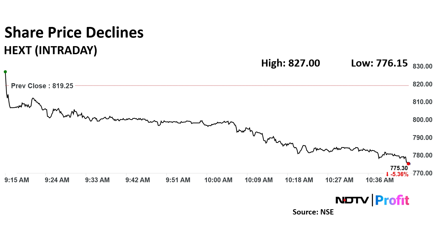 The scrip fell as much as 4.72% to Rs 780.55 apiece. It pared losses to trade 4.52% lower at Rs 782.25 apiece, as of 10:39 a.m. This compares to a 0.12% advance in the NSE Nifty 50.