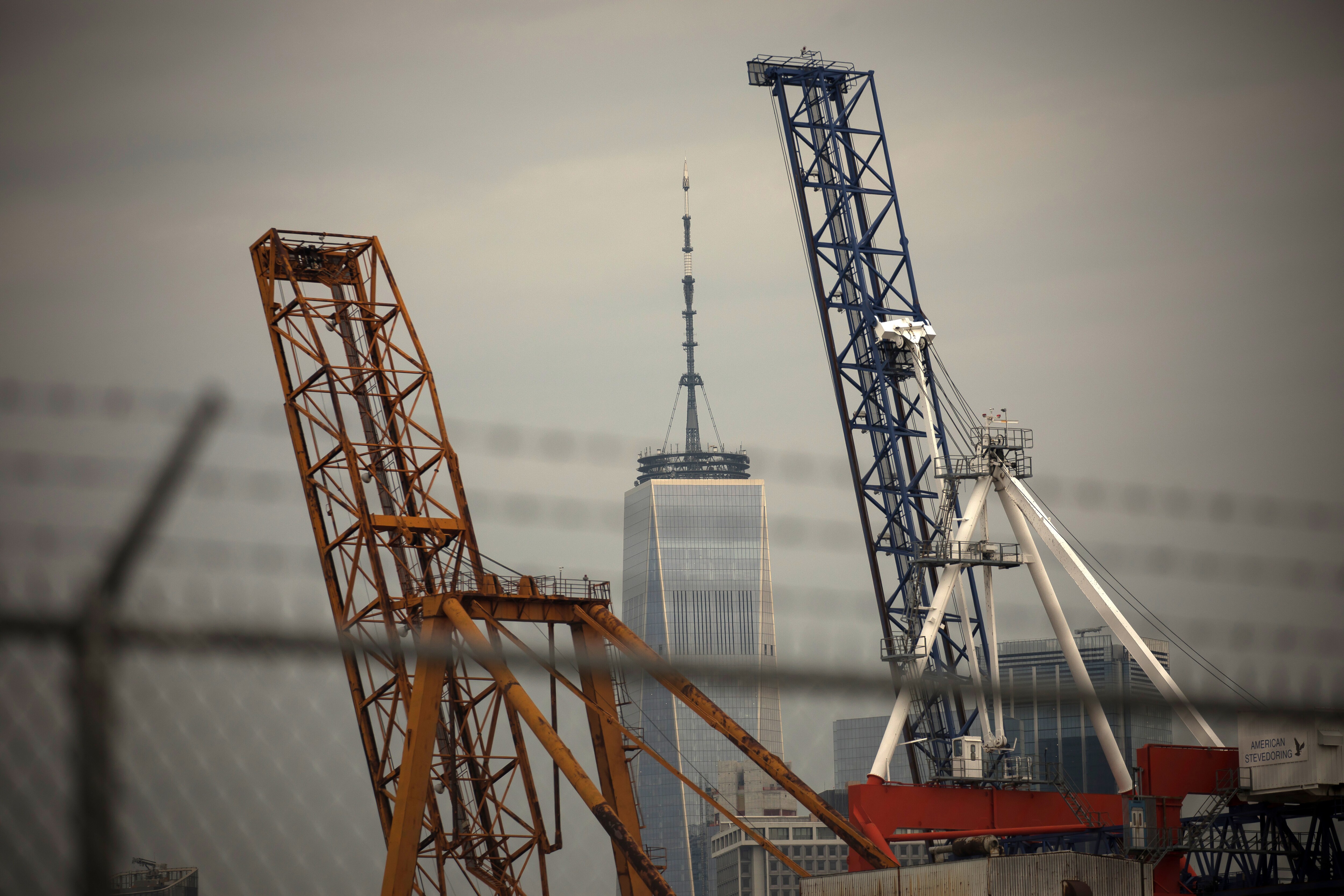 Cranes stand in front of trade Center. (Photographer: Michael Nagle/Bloomberg)