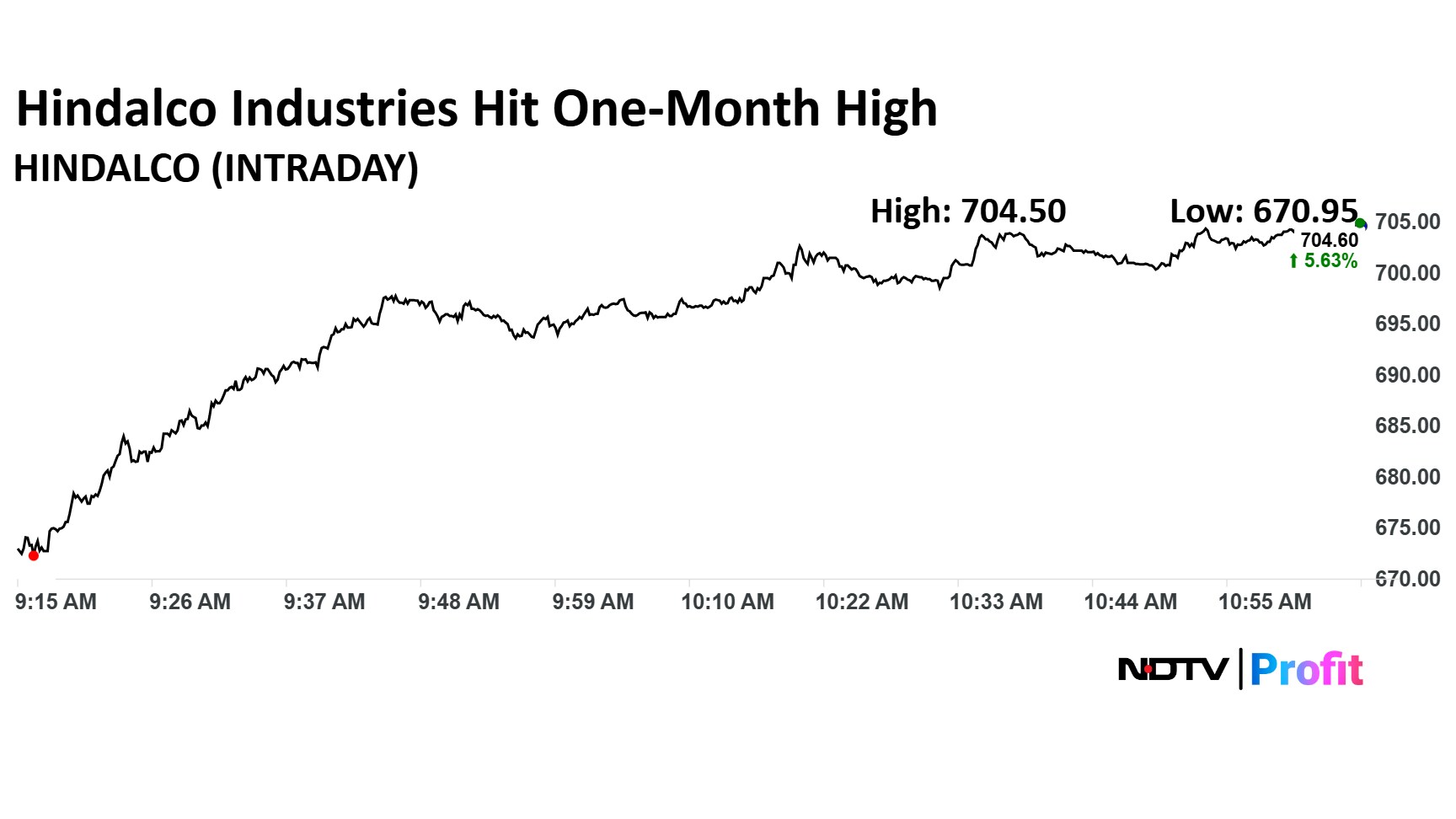 Hindalco Industries share price advanced 5.68% to Rs 704.50 apiece, the highest level since July 3. It was trading 5.23% higher at Rs 702.90 apiece as of 11:21 a.m., compared to 0.40% advance in the NSE Nifty 50 index.