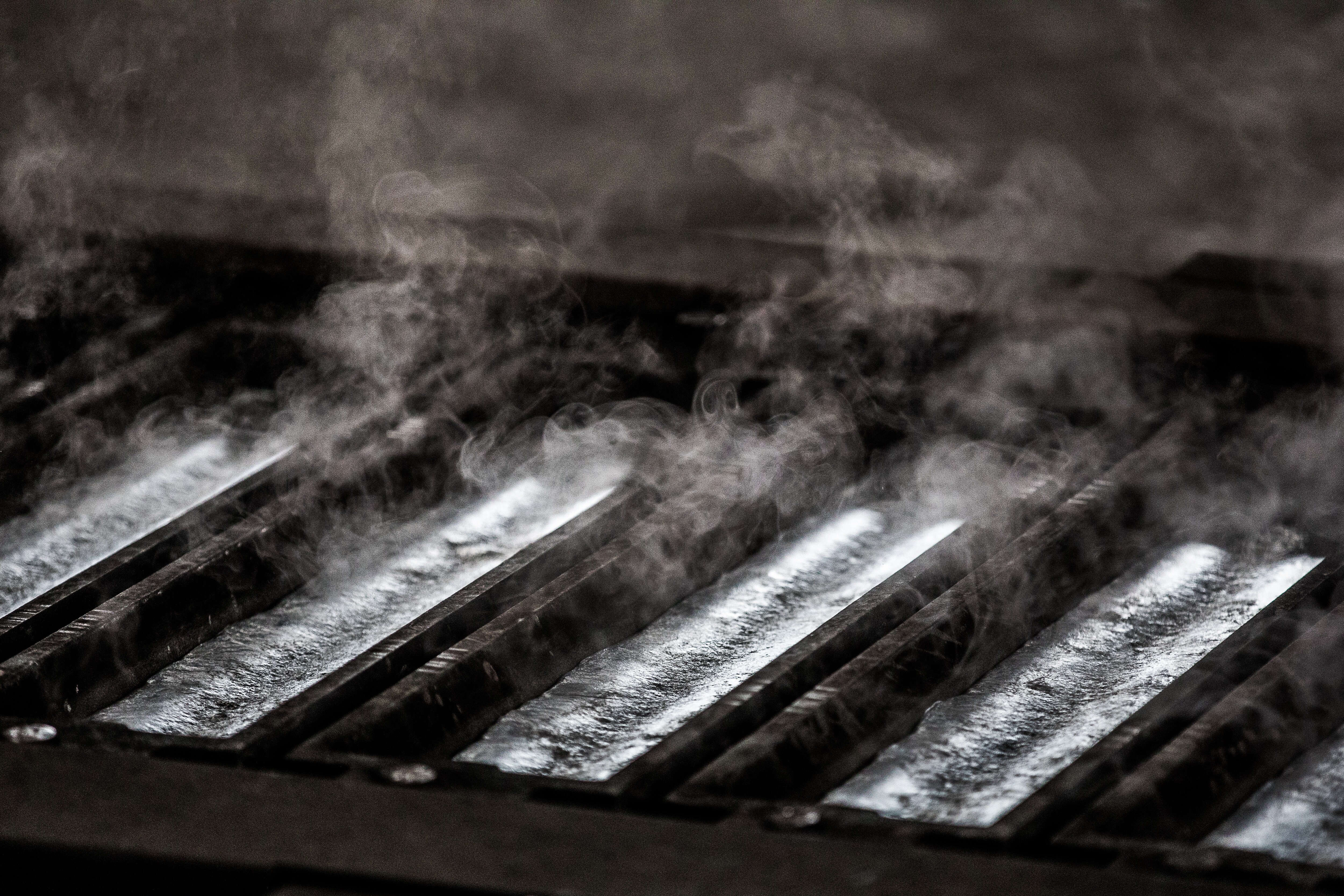 Steam rises from molten aluminum as it cools inside ingot molds at a processing plant. (Photographer: Akos Stiller/Bloomberg)