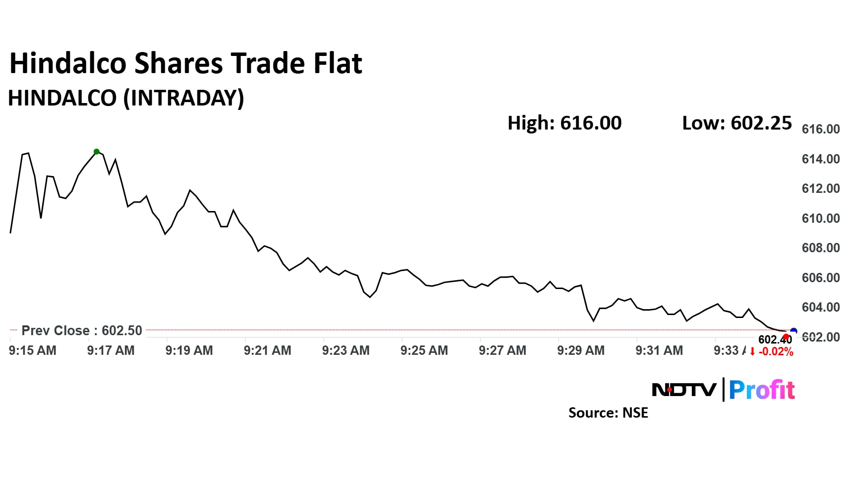 Hindalco stock rose as much as 2.24% during the day to Rs 616 apiece on NSE. It was trading 0.27% higher at Rs 604.1 apiece, compared to a 0.05% decline in the benchmark Nifty 50 as of 9:32 a.m.