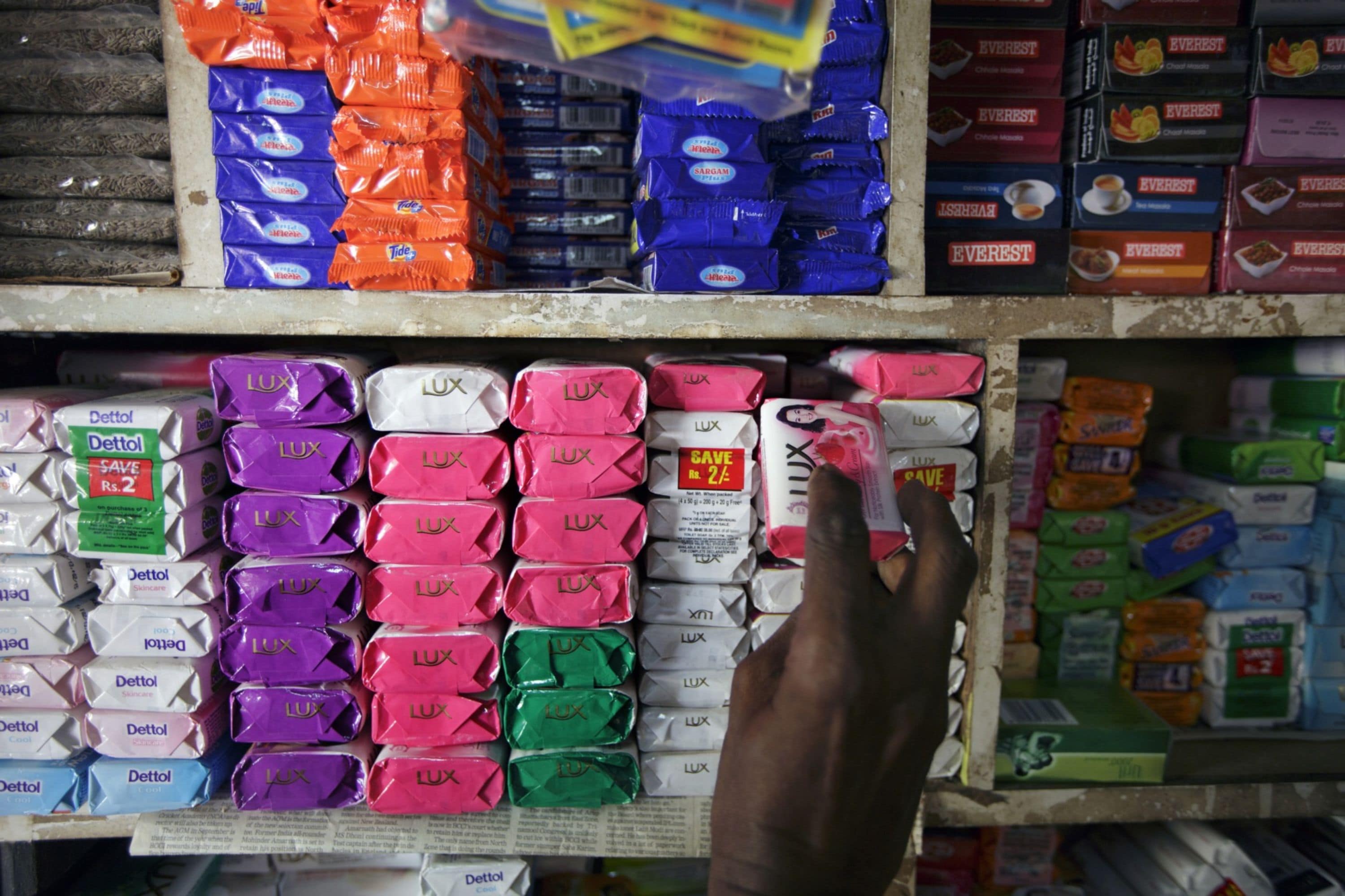 A man takes a bar of Hindustan Unilever Ltd. Lux soap off a shelf at a store in Mumbai. (Photographer: Kuni Takahashi/Bloomberg)