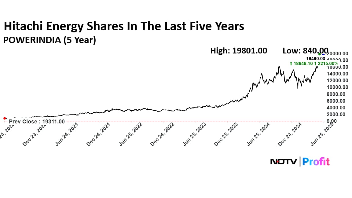 Shares of Hitachi Energy had slipped to a low of Rs 837.05 in August 2020 before it saw a steady climb. The share price then rose to Rs 20,298 in May 2025, marking the high point in the five-year period.