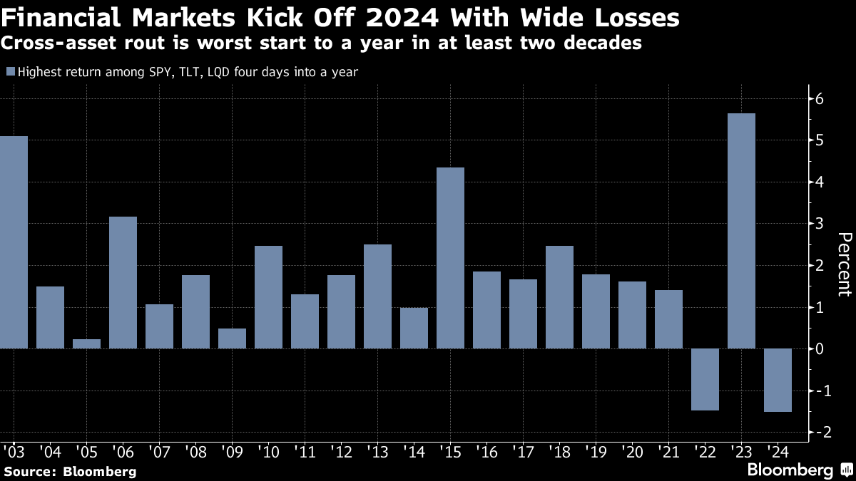 In a reversal from the everything rally in the final months of 2023, all major asset classes fell in the holiday-shortened week. Widely followed exchange-traded funds tracking equities and fixed income declined at least 1.5% over the first four sessions, the worst pan-markets slump to start a year since the two popular bond ETFs were created in mid-2002.