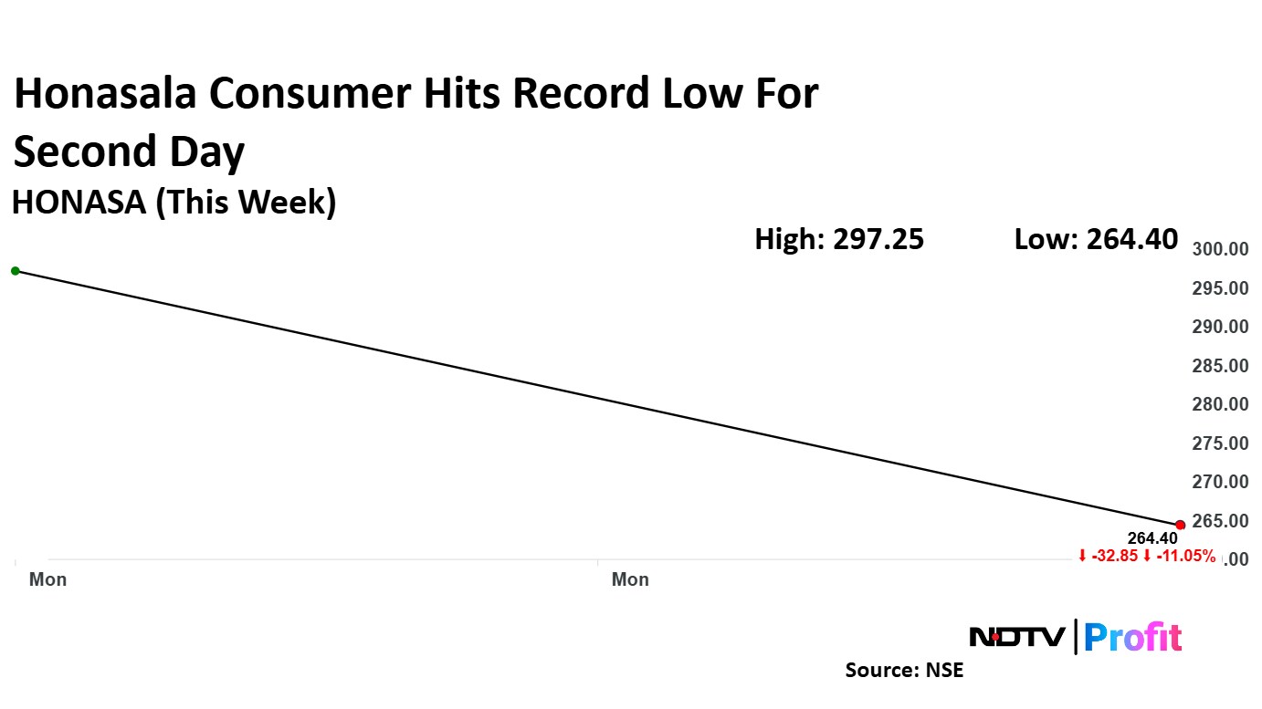 Honasa Consumer share price declined 18.47% to Rs 242.35 apiece, hitting the lowest level since its listing. The stock pared losses to trade 10.11% down at Rs 267.20 apiece as of 10:23 a.m., as compared to 1.06% advance in the NSE Nifty 50 index.