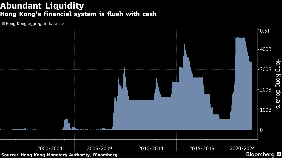 Investors parked their cash in the city because of its relatively safe and easily convertible currency. The abundance of money meant that even when the Fed raised borrowing costs in the 2015-2018 cycle, local rates stayed relatively low. The aggregate balance -- a measure of interbank money supply in Hong Kong -- is about 70 times greater than it was before the global financial crisis.