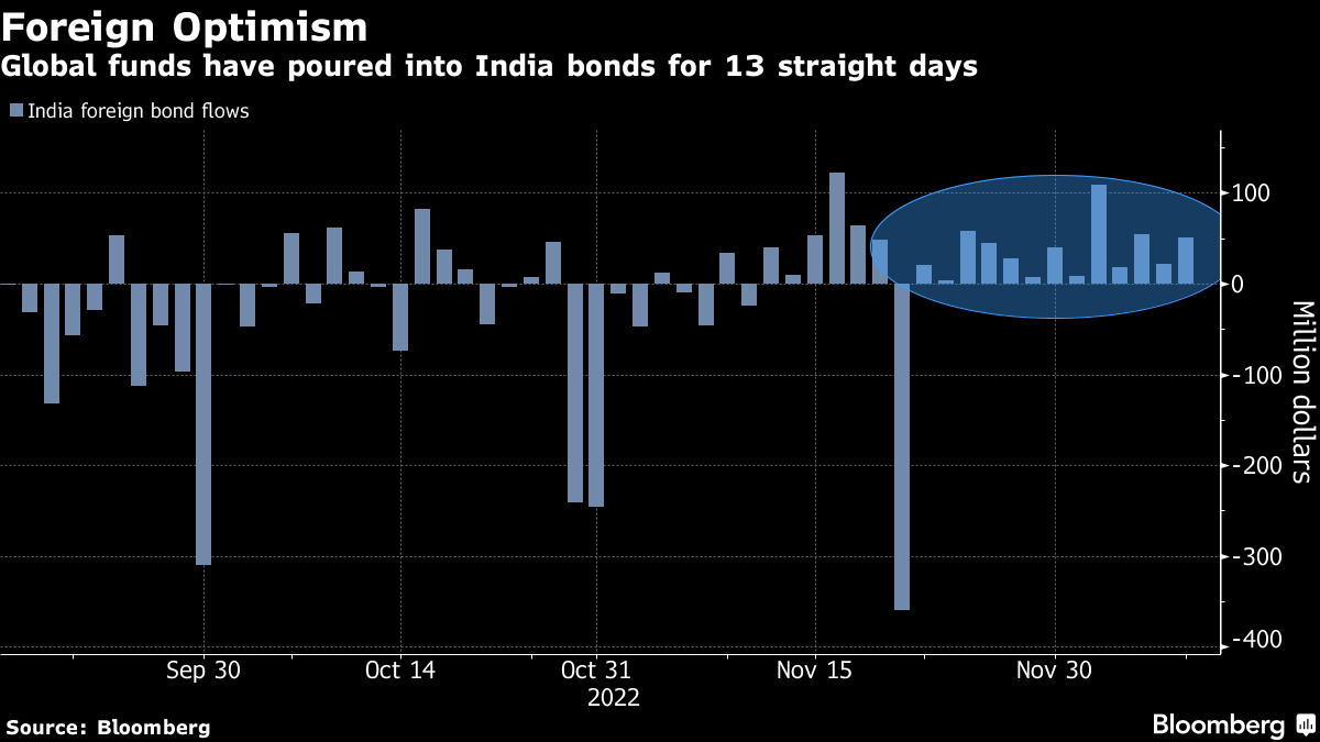 Global funds have poured a cumulative $465 million into Indian bonds over 13 straight days, the longest stretch since June 2017, on optimism that the US Federal Reserve and Reserve Bank of India may slow the pace of rate increases. Monday's November retail inflation data will be closely watched to see if that view still holds.