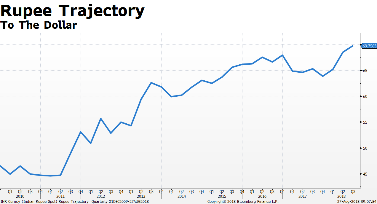 The rupee fall is still not as steep as in 2013 when the Indian currency weakened 22 percent in four months in May-August as the U.S. Federal Reserve indicated that it would start winding down its easy-money policy implemented after the 2008-09 credit crisis.