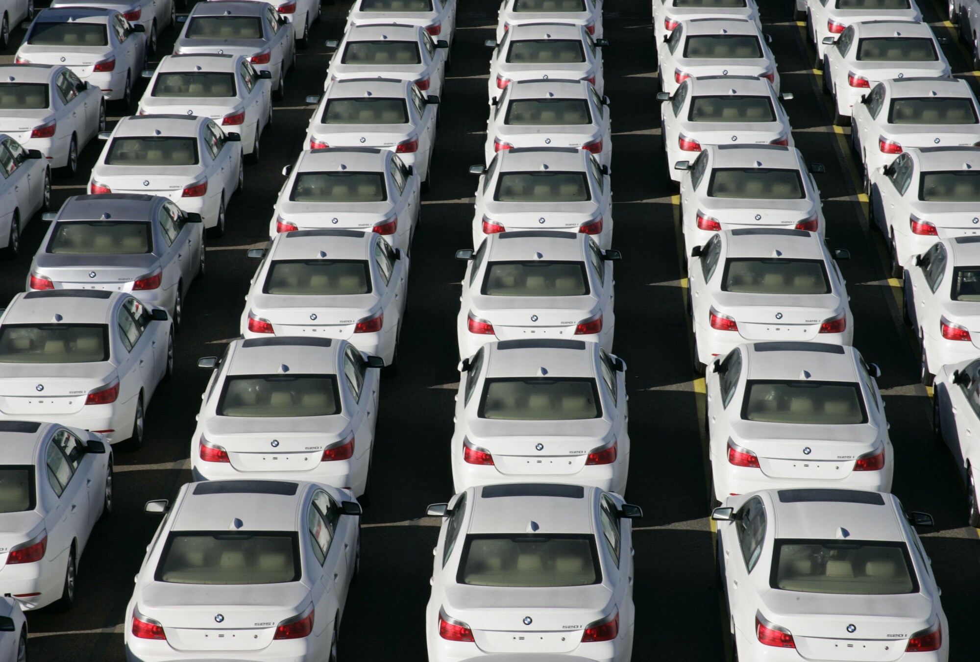 BMW cars parked prior to export at a terminal in Bremerhaven, Germany. (Photographer: Jochen Eckel/Bloomberg News)