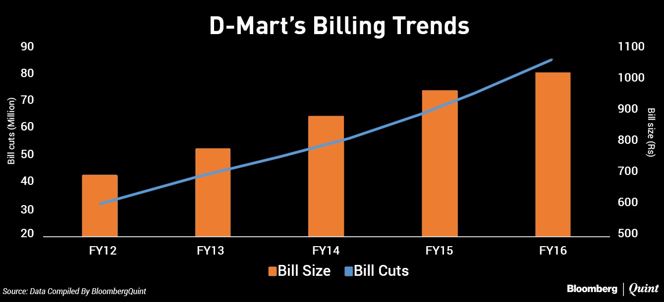 D-Mart's average bill value and number of bills generated have been consistently growing over the last five years, while the sales growth from same stores has been around 24 percent.