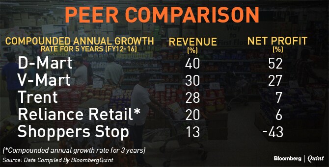 D-Mart's valuation is expected to be 1.5 times its revenue, while the stock is expected to trade close to 38 times its financial year 2016-2017 earnings. Ahead of D-Mart's IPO, the other listed retailers—Future Retail, Trent, Aditya Birla Fashion and Retail and Shoppers Stop -- have seen a run-up after struggling in the last two quarters of FY17.