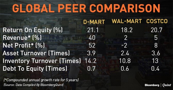 Wal-Mart Stores and Costco Wholesale are the largest listed retail supermarket chains by market capitalisation. Avenue Supermarts beats the world's two largest listed retailers on all parameters, except for debt-to-equity.