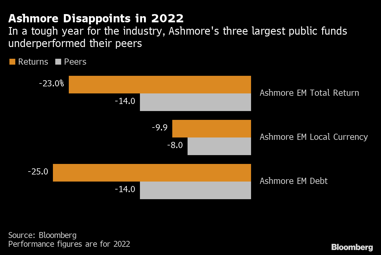 Ashmore was far from alone in losing money in the down market. Yet its public funds were among the hardest hit. Its short duration fund lost almost 25%, underperforming around 98% of its peers in 2022, according to data compiled by Bloomberg. And its three largest public money pools all underperformed their peer groups, Bloomberg compiled data show.
