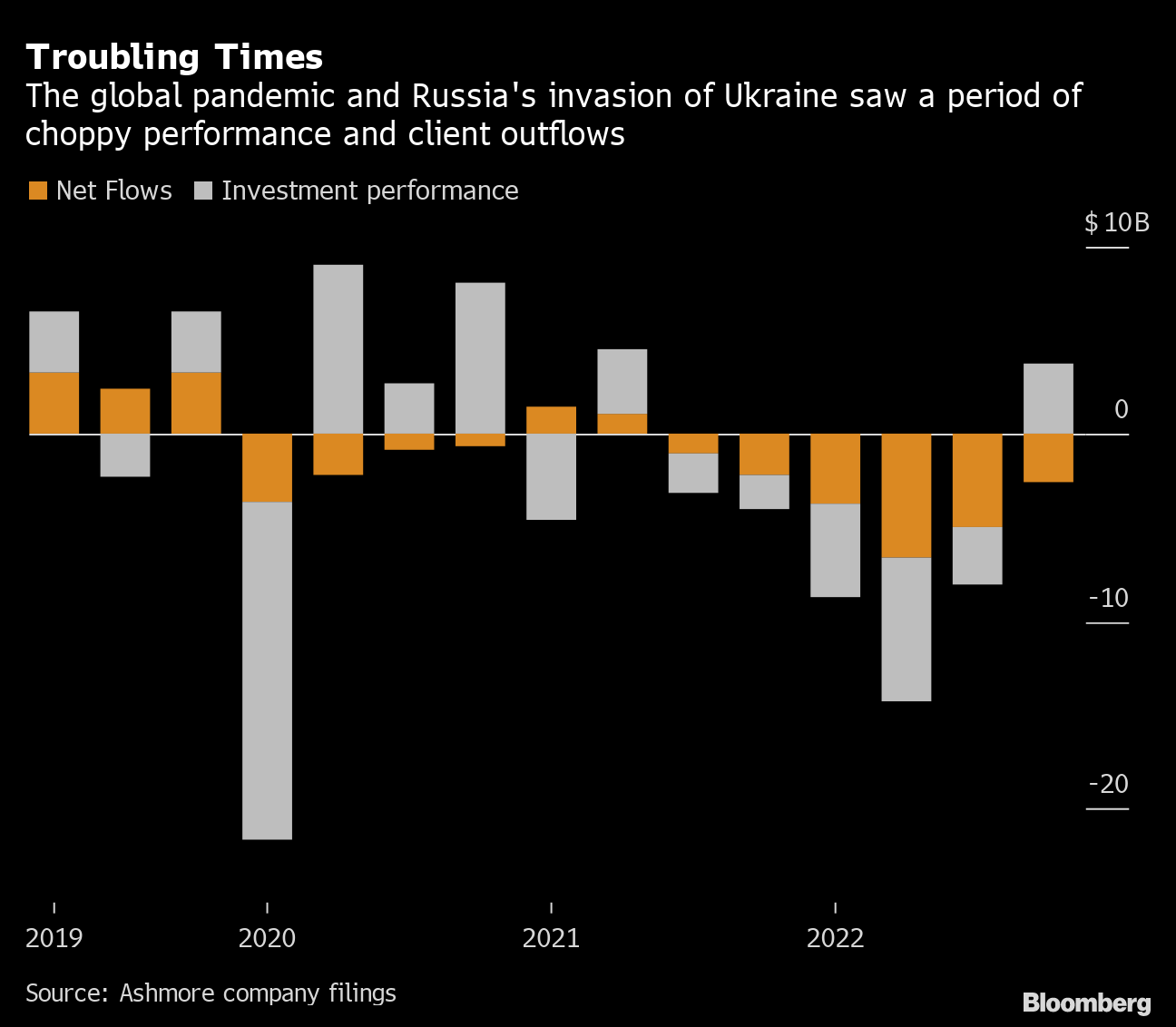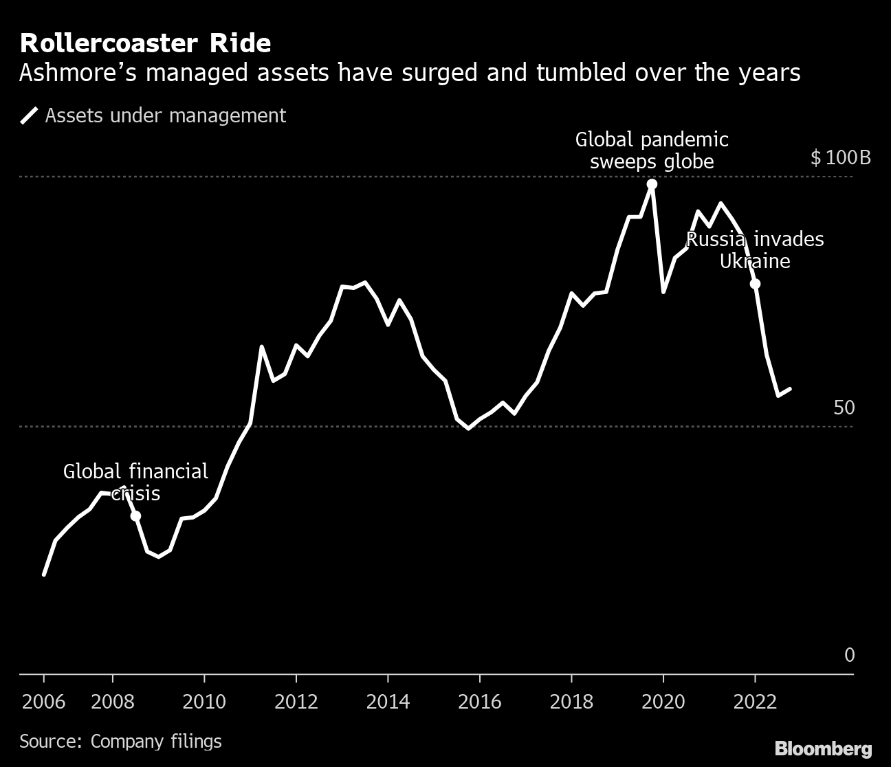 Ashmore Group Plc rode the emerging-market wave to pull in billions of dollars of client money. Then came the pandemic, war in Ukraine and a global jump in rates that made investors reassess risk. At the asset manager — known for its high conviction bets and bullish style — by the time 2022 was out, negative performance and outflows had combined to erase $40 billion of assets.