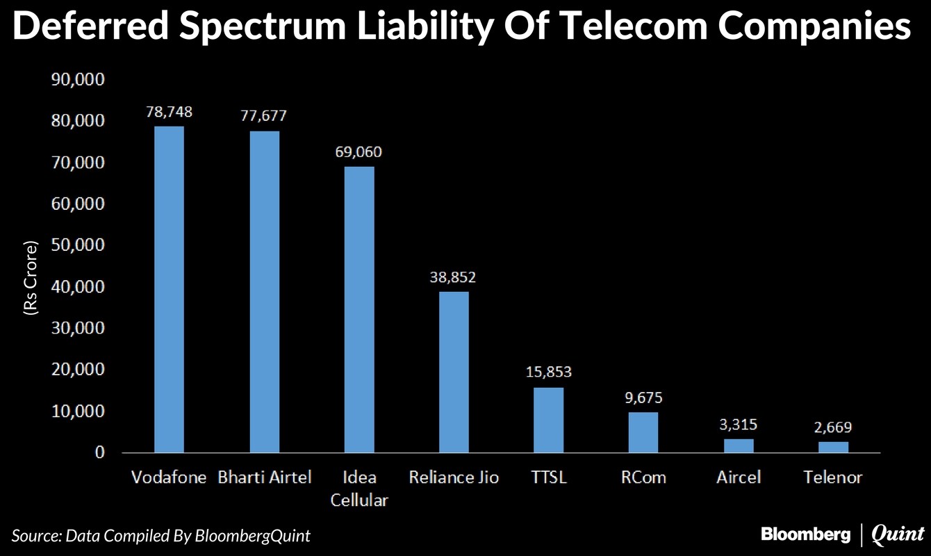 A part of the spectrum auction amount is taken as upfront payment by the Department of Telecom and the rest is paid in 10 instalments after a two-year moratorium. The sector has more than Rs 2.9 lakh crore as deferred spectrum liability, according to the data compiled by BloombergQuint.