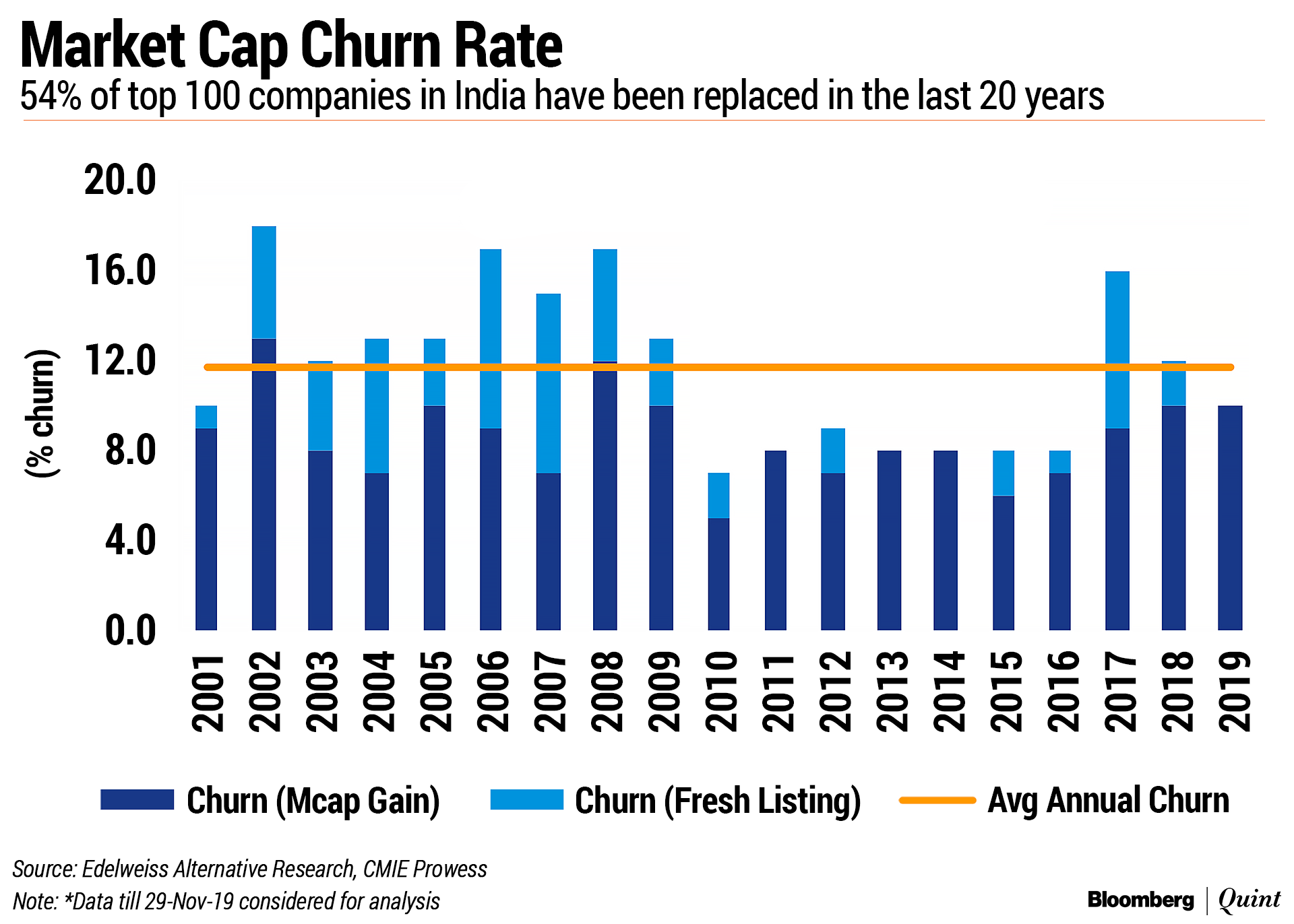 On average, the composition of top 100 changed 11 percent every year—3 percent led by fresh listing and 8 percent due to the change in market capitalisation, Edelweiss said in the report. “The highest contribution to this churn has come from banking financial services insurance (14 of 54 stocks), followed by consumer-oriented (nine stocks).”