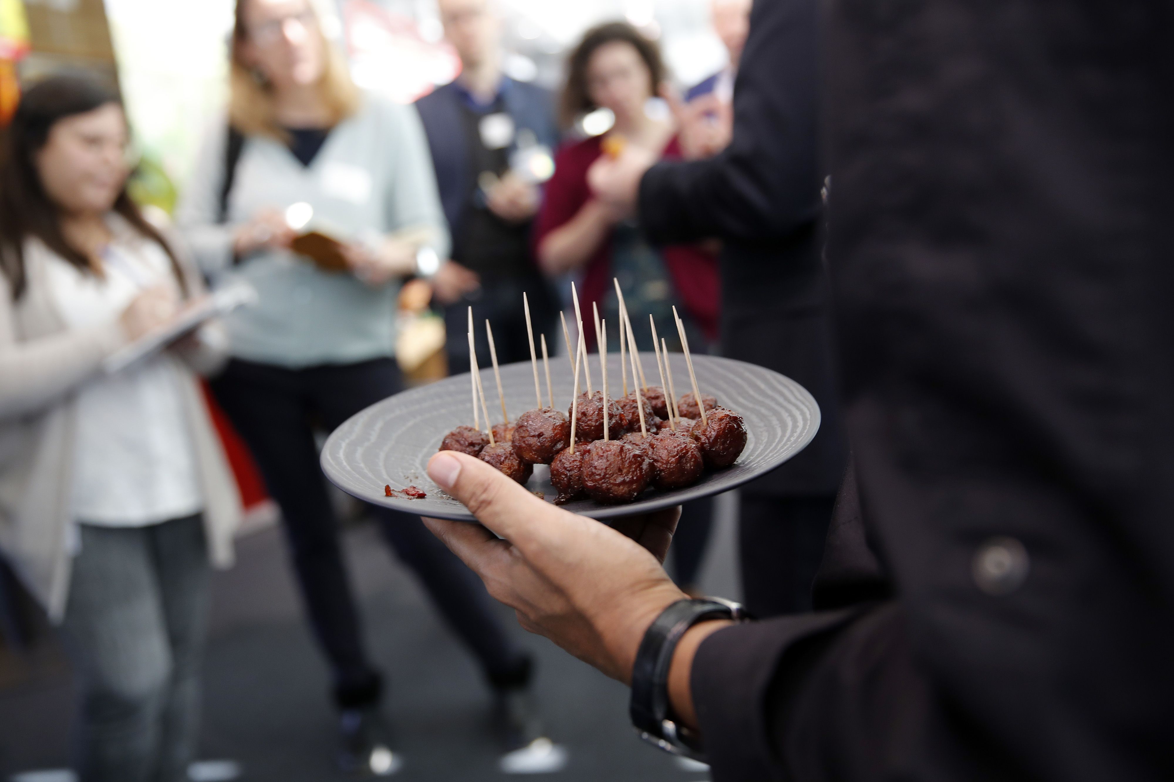 A worker serves plant-based meatballs. (Photographer: Stefan Wermuth/Bloomberg)