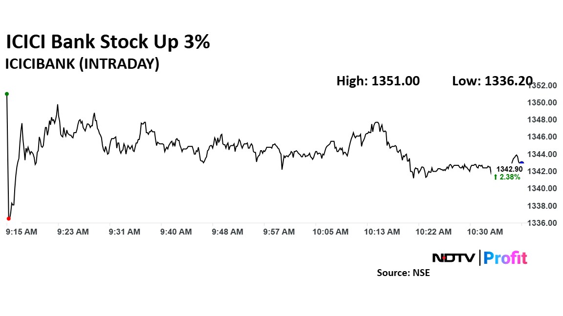 ICICI Bank stock rose as much as 3% during the day to Rs 1,351 apiece on the NSE. It was trading 2.34% higher at Rs 1,342.3 apiece, compared to a 2.12% and 2.32% advance in the benchmark Nifty 50 and Nifty Bank as of 10:28 a.m.