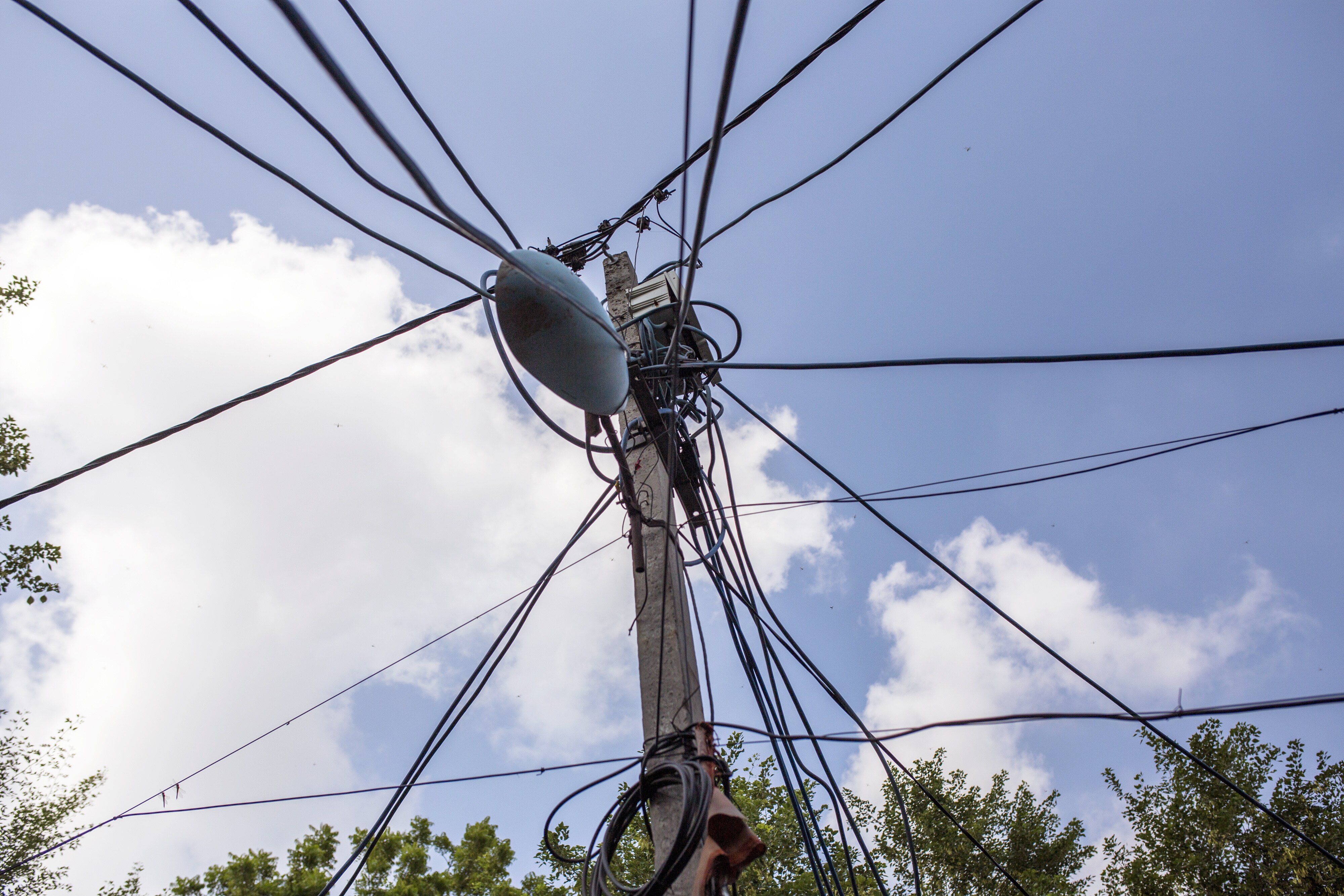 Utility and power cables hang from a pole in the Khilona Wala Bagh slum cluster in New Delhi. (Photographer: Prashanth Vishwanathan/Bloomberg)