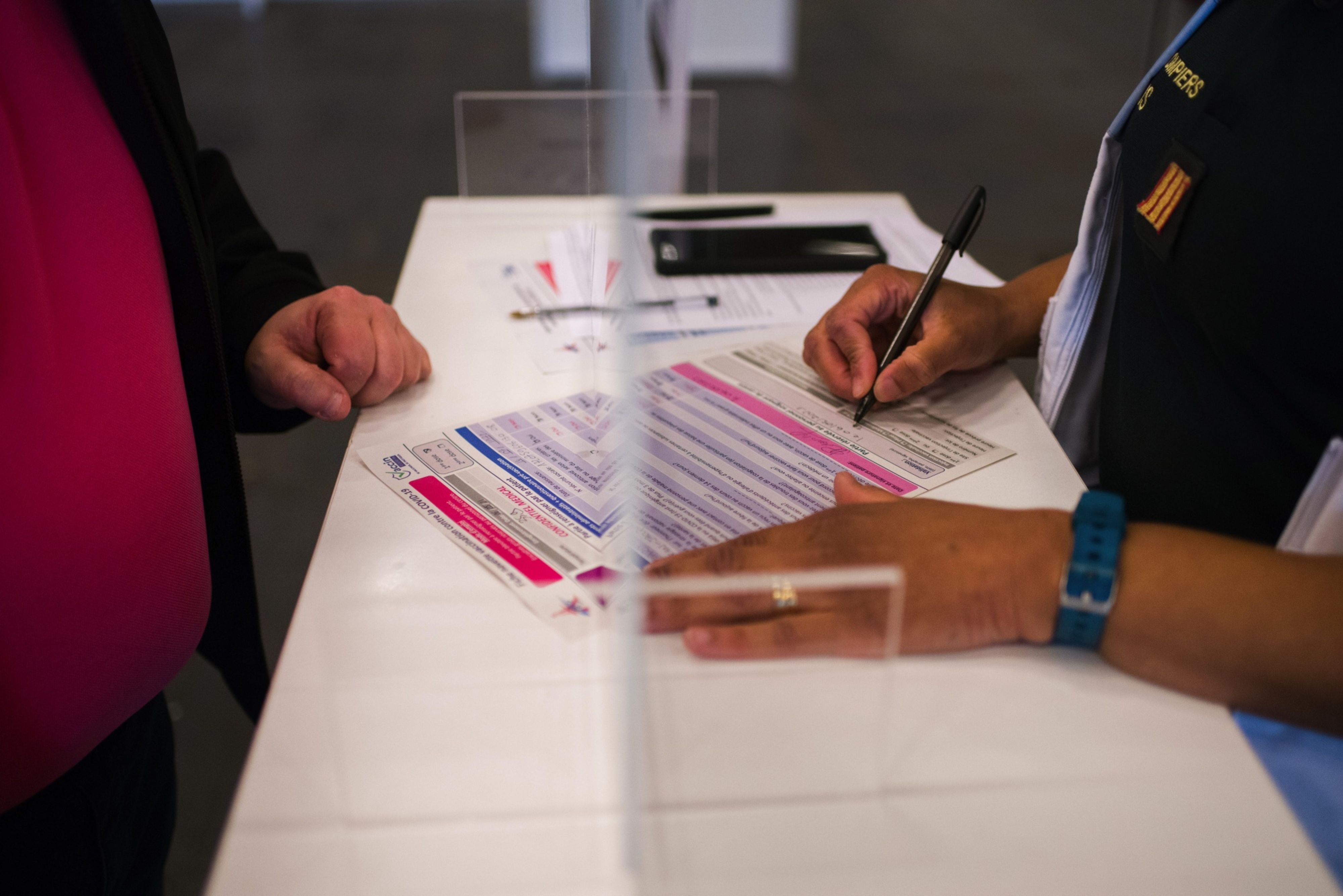 A person fills a registration form. (Photographer: Nathan Laine/Bloomberg)