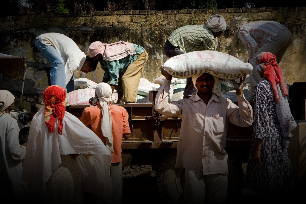 Indian labourers unload bags of cement from a truck in Gurgaon (Photographer: Adam Ferguson/Bloomberg News)