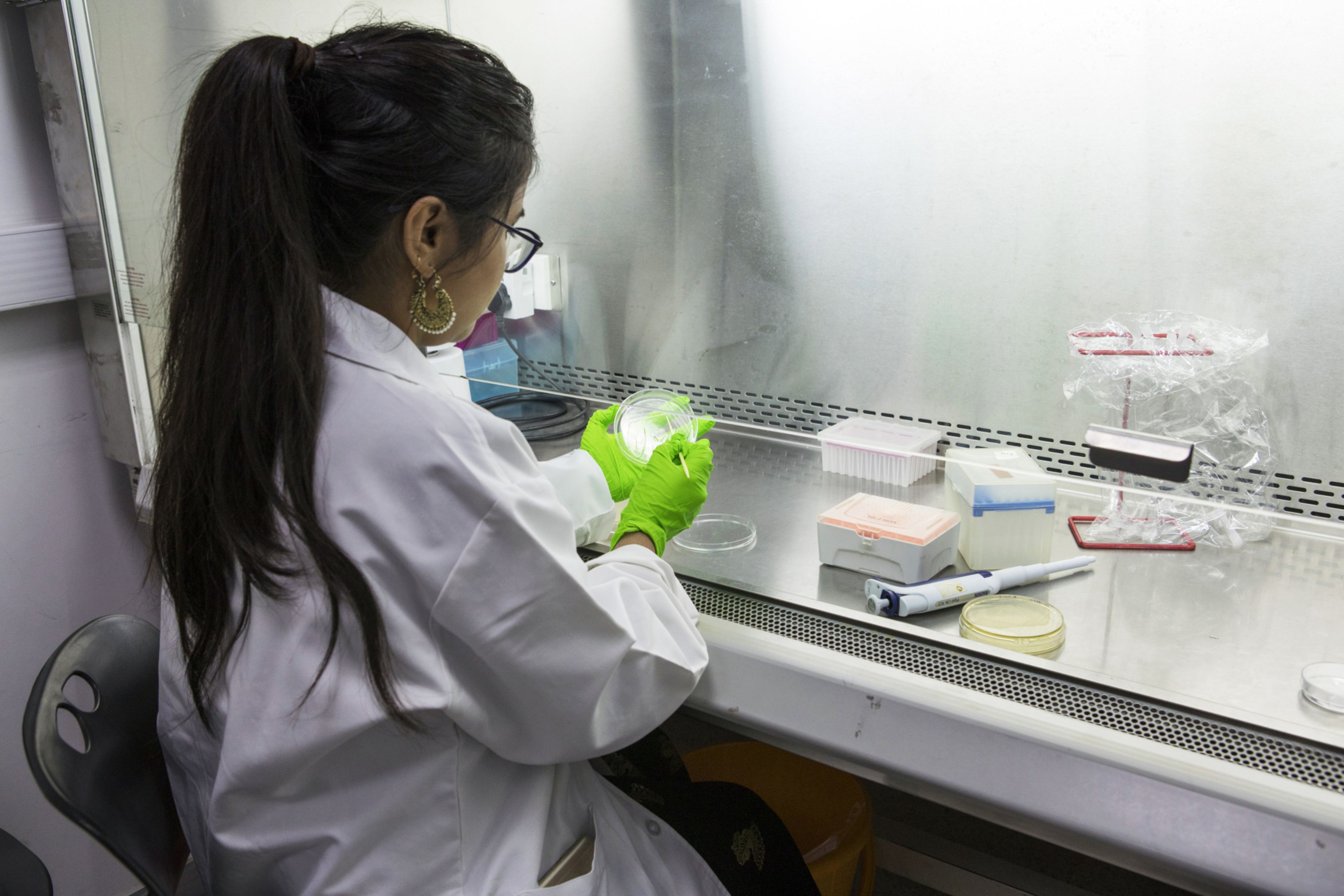 A technician holds an agar plate containing bacteria cell culture at a Bugworks Research India Ltd. laboratory in Bengaluru, India. (Photographer: Samyukta Lakshmi/Bloomberg)