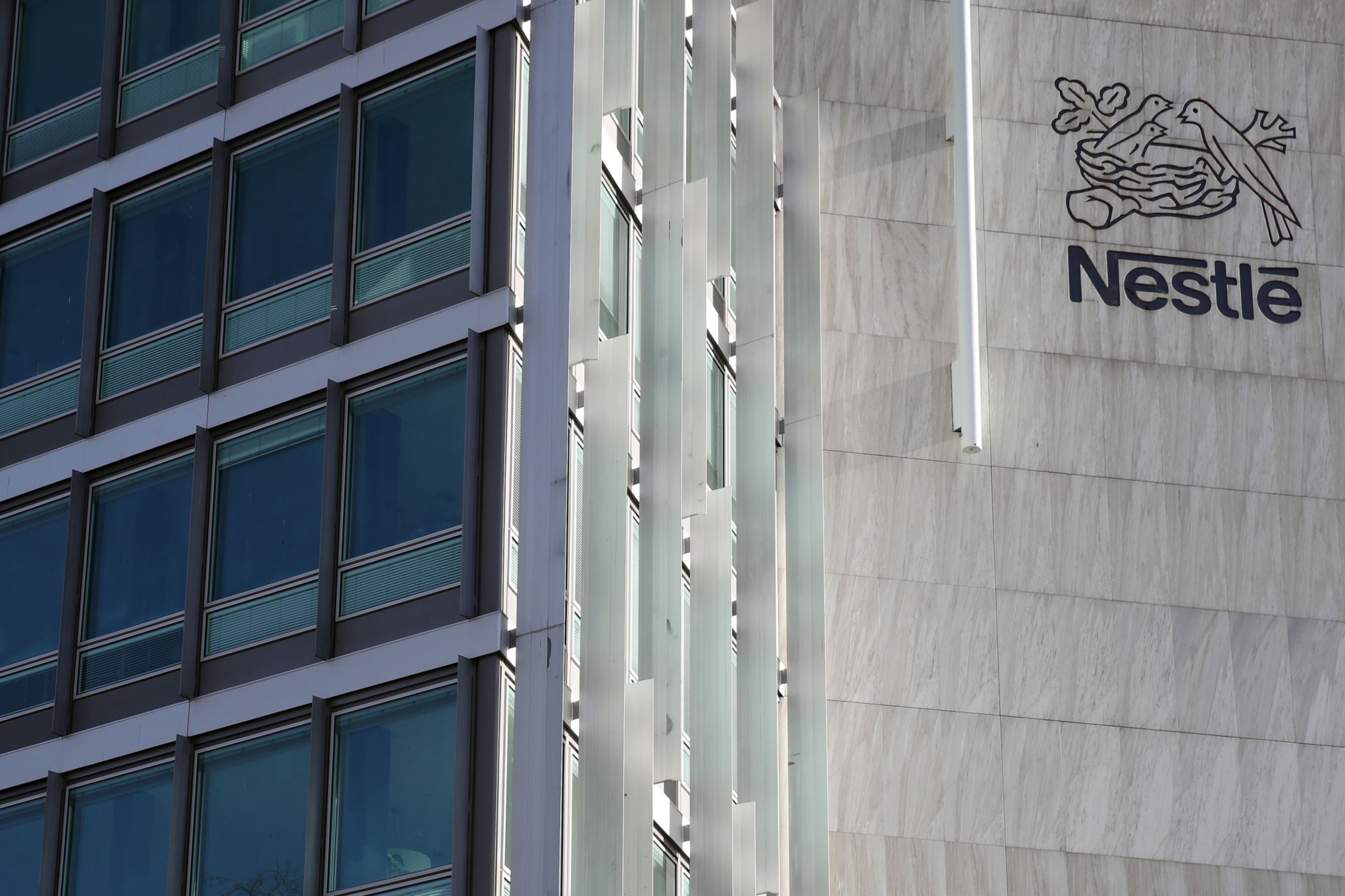 A bird’s nest logo sits on display at the Nestle SA headquarters in Vevey, Switzerland. (Photographer: Stefan Wermuth/Bloomberg)