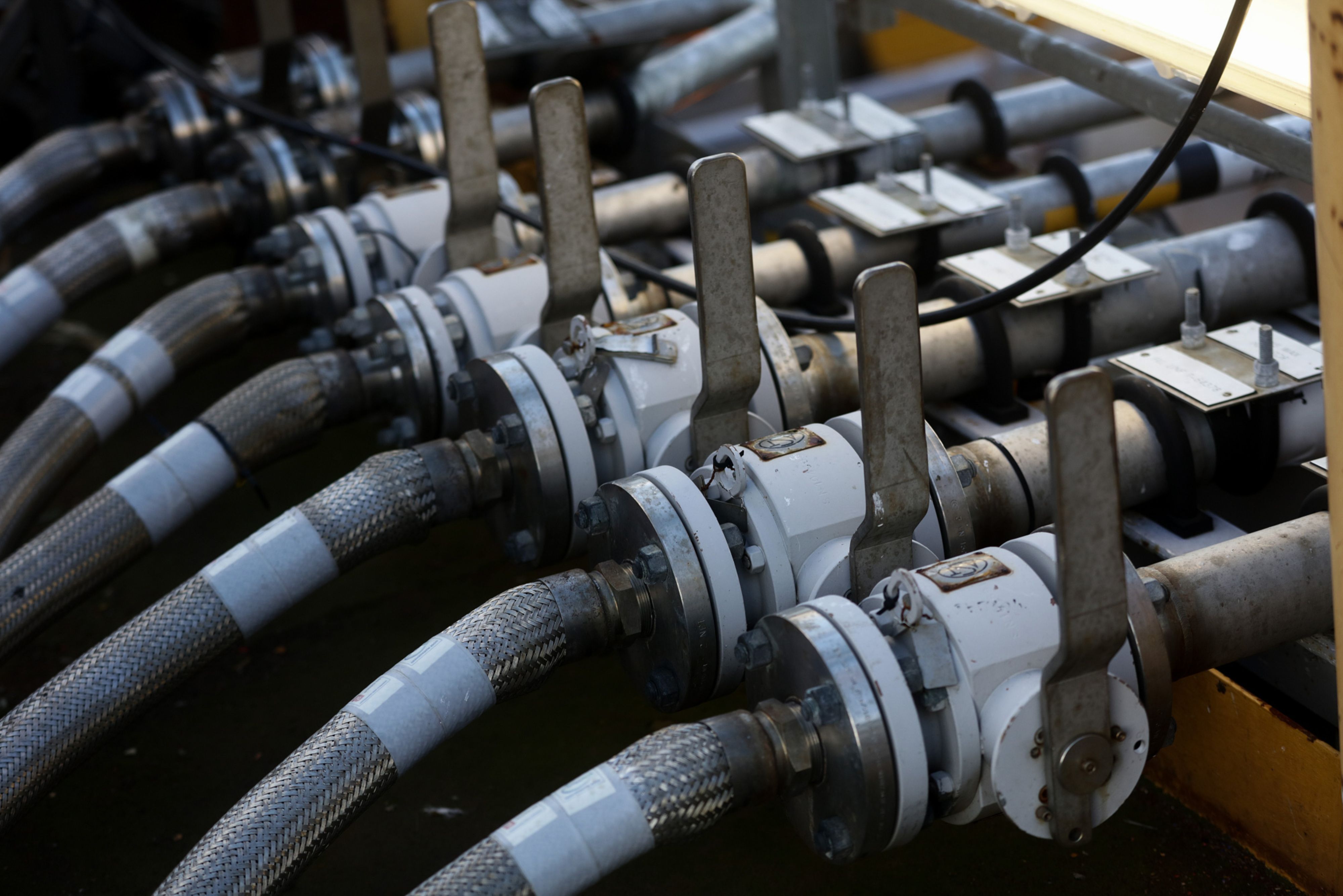 Petroleum Pipes sit on top of the well deck of a gas condensate platform in U.K. (Photographer: Simon Dawson/Bloomberg)