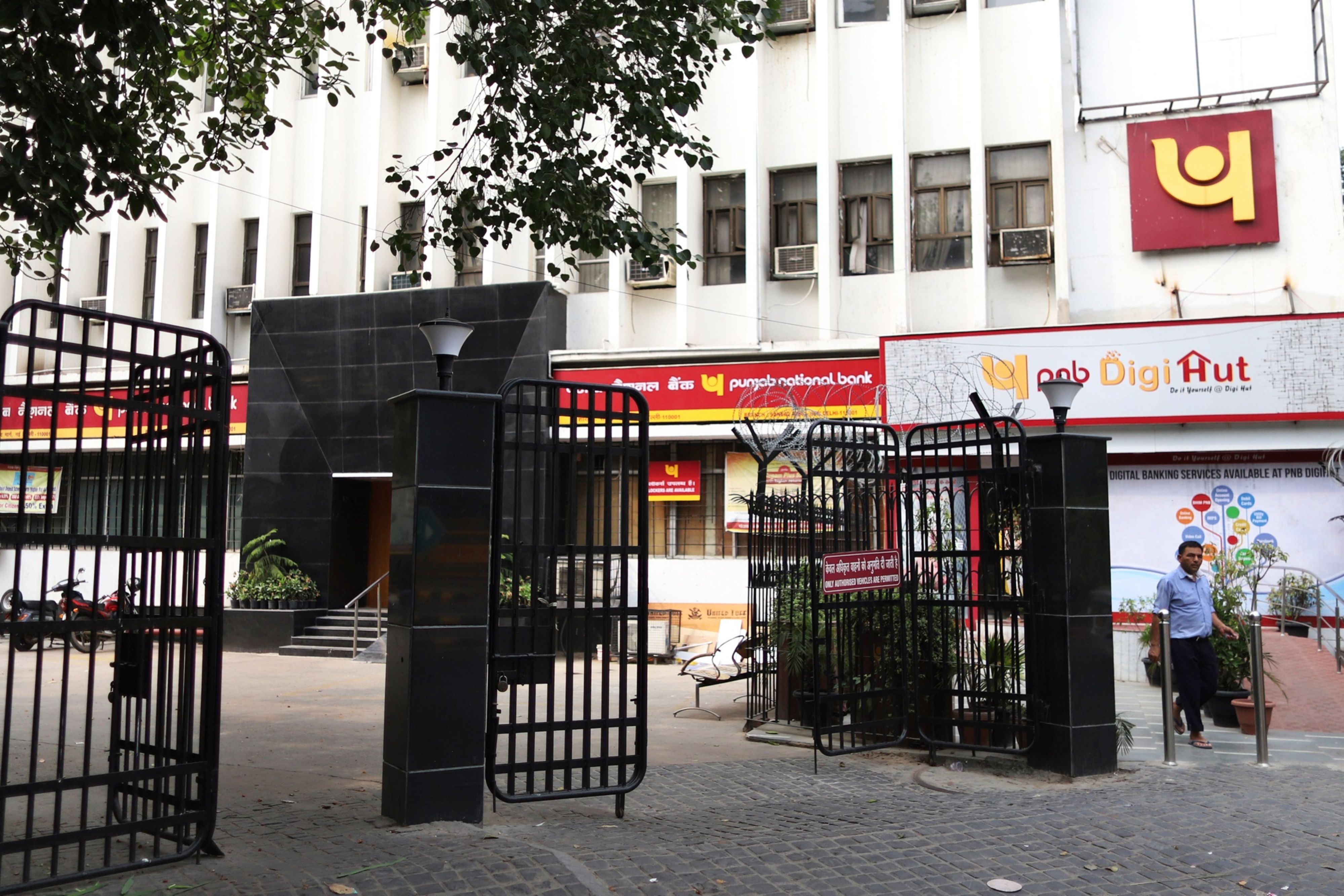 A pedestrian walks past a Punjab National Bank (PNB) office building in New Delhi. (Photographer: Anindito Mukherjee/Bloomberg)