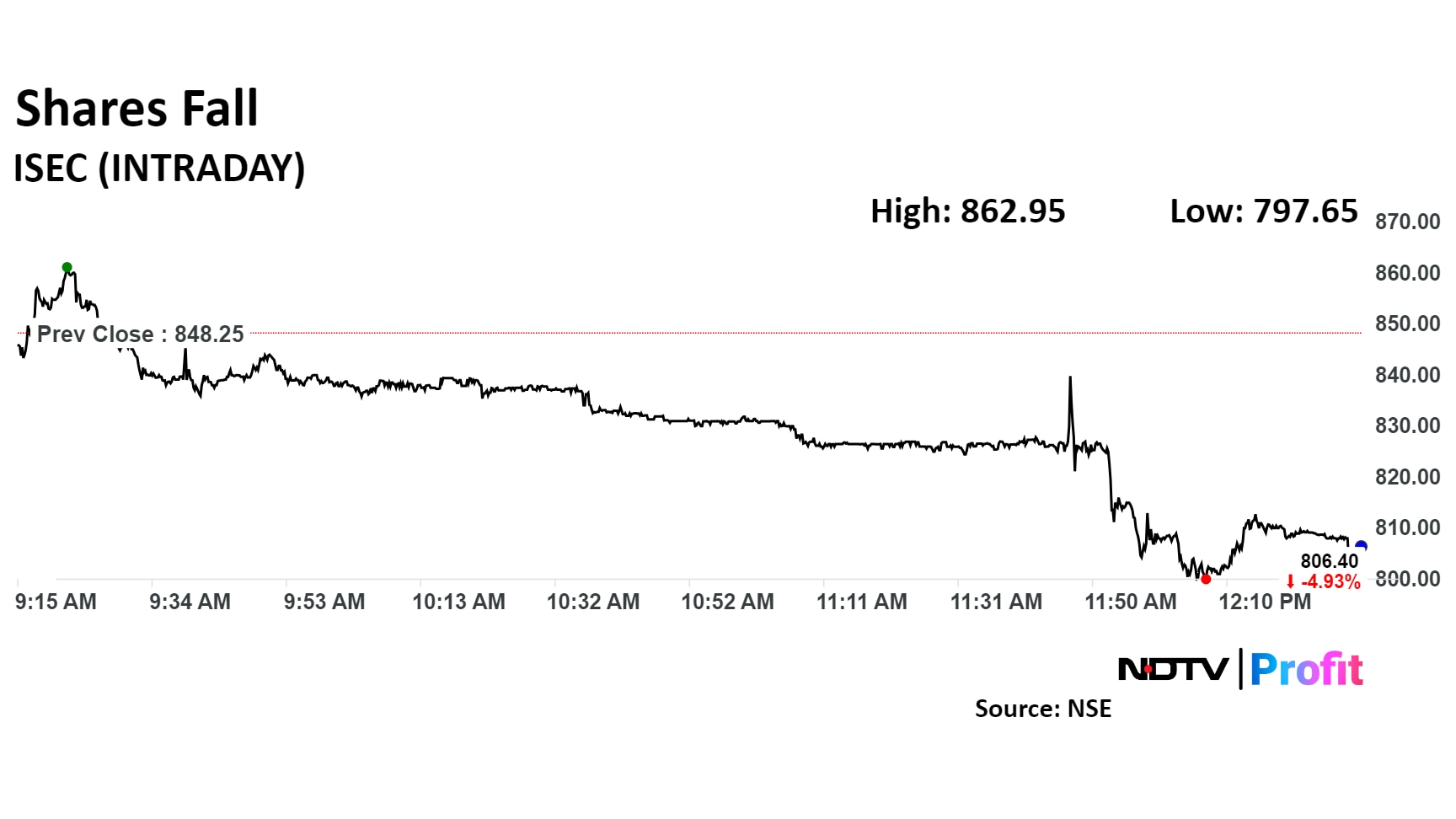 Shares of the company fell as much as 5.97% to Rs 797.65 apiece, the lowest level since Aug. 16. It pared losses to trade 4.92% lower at Rs 806.50 apiece as of 12:20 p.m. This compares to a 0.22% advance in the NSE Nifty 50 Index.
