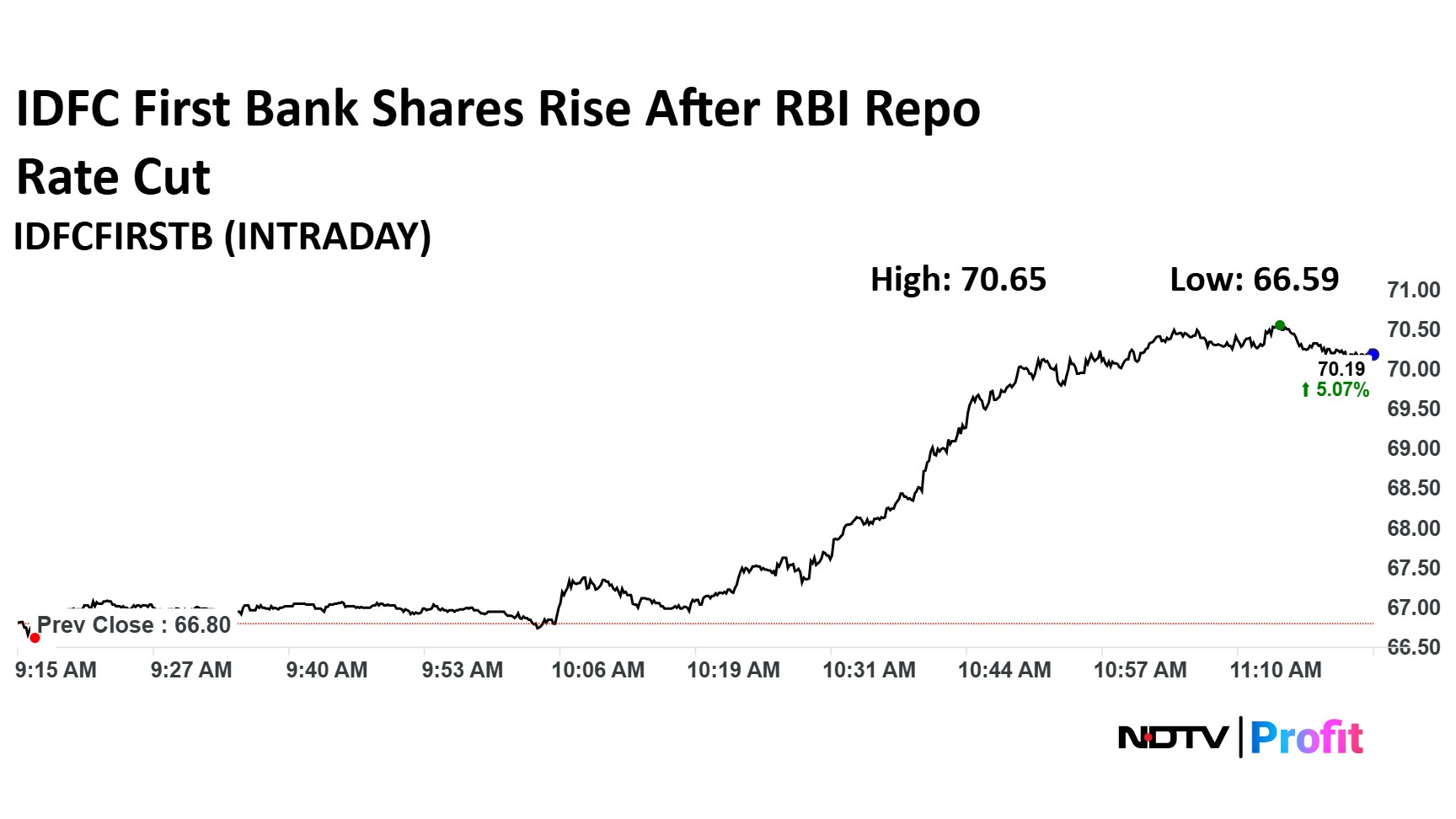 Share price for IDFC First Bank rose as much as 5.76% to Rs 70.65 apiece, the highest level since Oct. 22, 2024. It pared gains to trade 5.06% higher at Rs 70.18 apiece, as of 11:30 a.m. This compares to a 0.92% advance in the NSE Nifty 50.