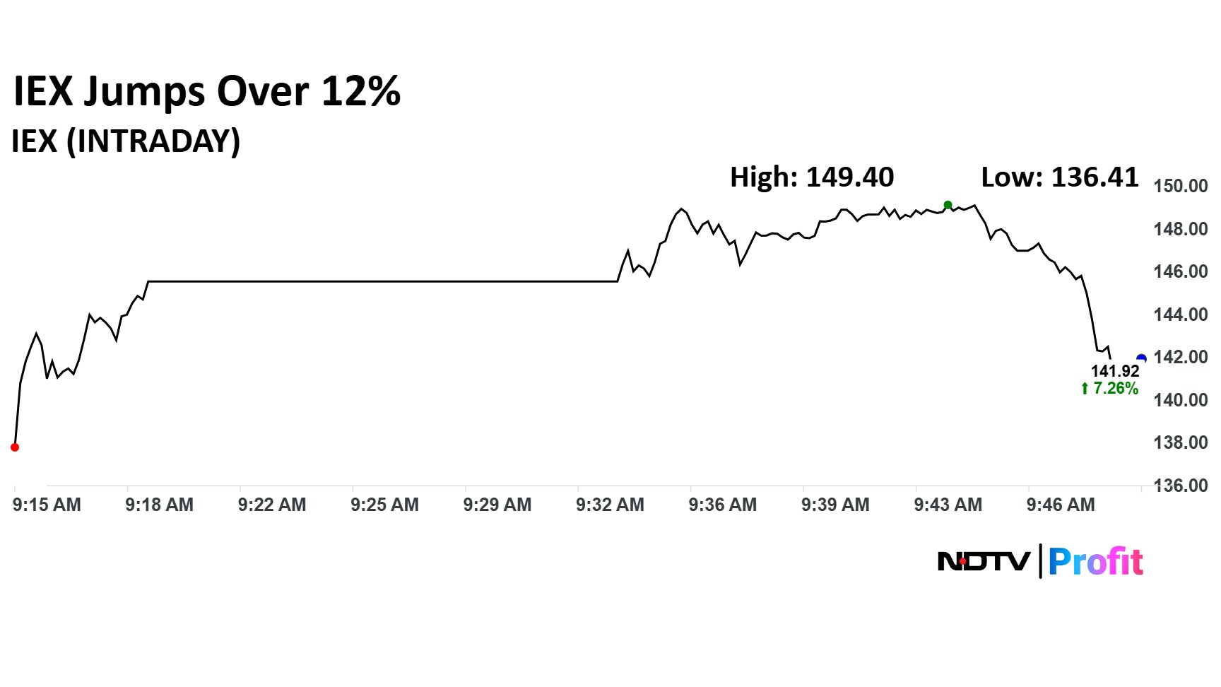 Indian Energy Exchange share price advanced 12.91% to Rs 149.40 apiece. The stock price was trading 11.35% higher at Rs 147.37 apiece as of 9:48 a.m., as compared to a 0.57% decline in the NSE Nifty 50 index.