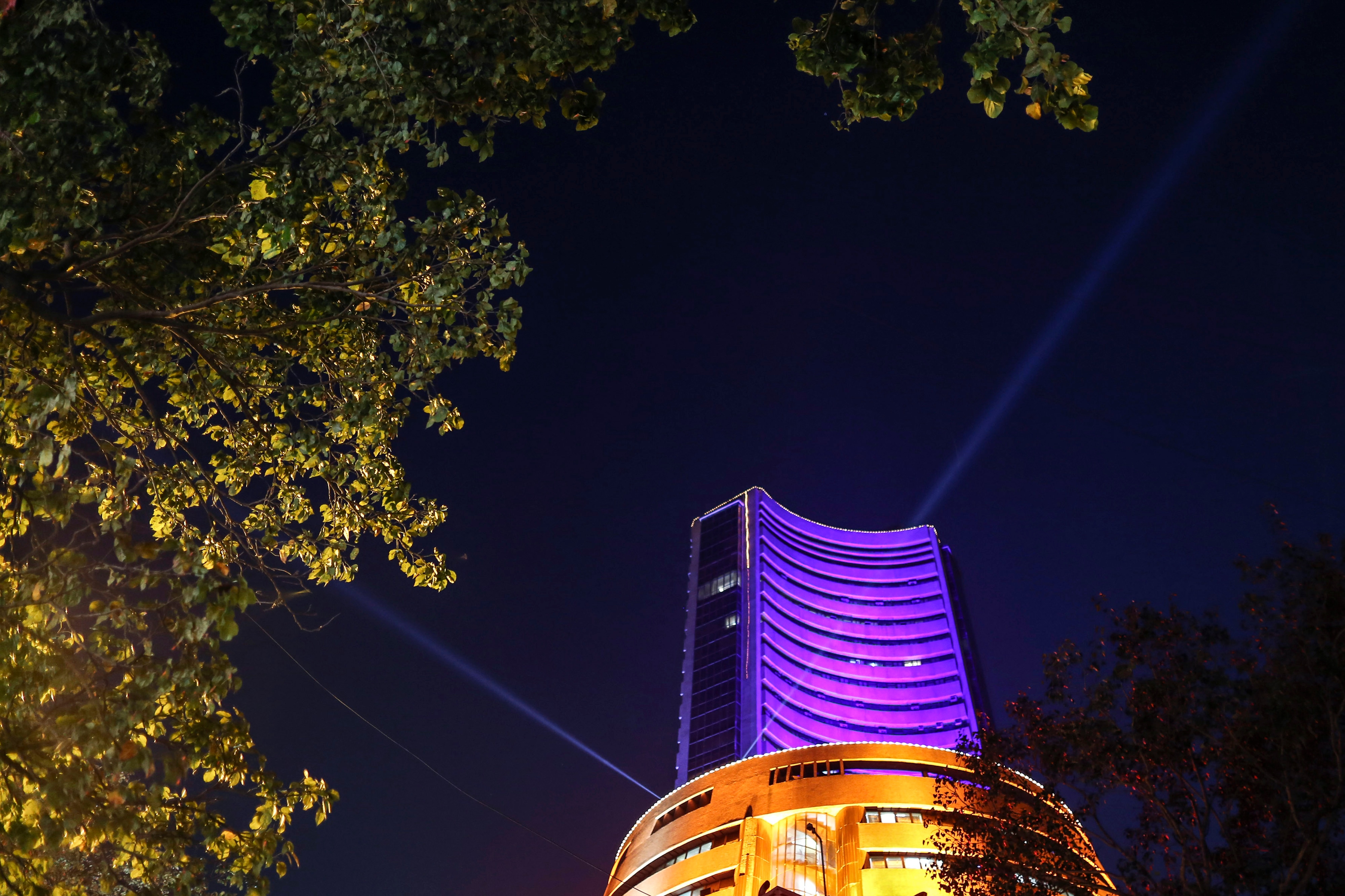 The Bombay Stock Exchange (BSE) building is illuminated during a special holiday trading session on the occasion of Diwali, the festival of light, in Mumbai, India (Photographer: Dhiraj Singh/Bloomberg)