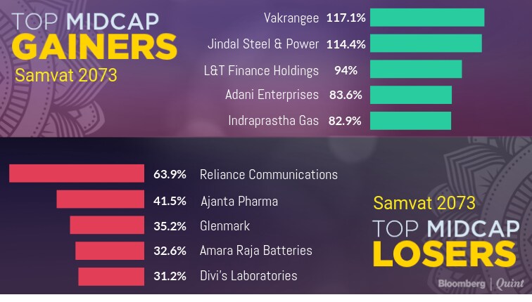 Information technology services management company Vakrangee Ltd. was the best performing mid-cap stock in Samvat 2073, followed by Jindal Steel & Power Ltd.