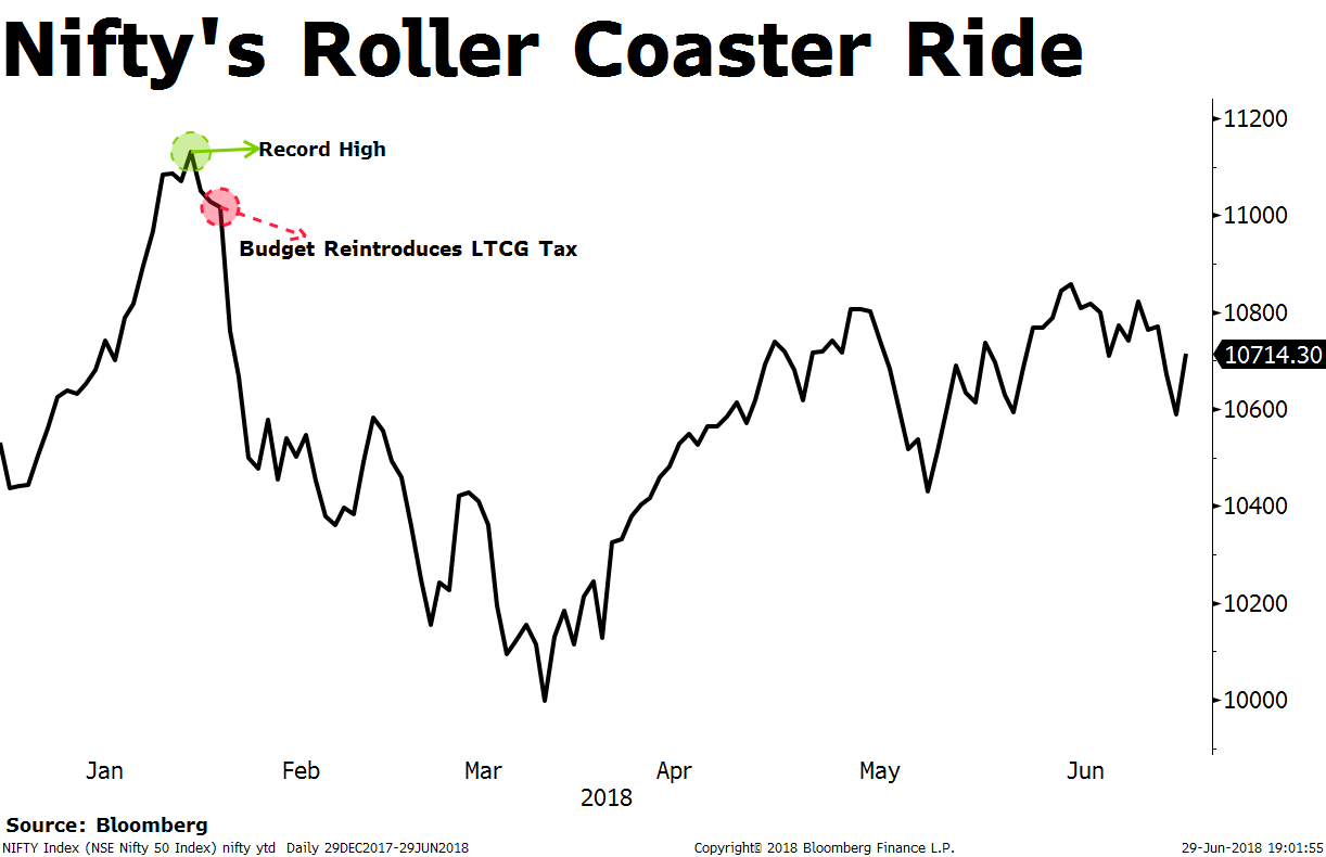 The 50-share benchmark has fallen from its record high of Jan. 29 and just about managed to stay in the green, supported by information technology companies and private lenders. Trade tensions and rising fuel prices have added to volatility, with the rupee faring the worst among Asian peers.
