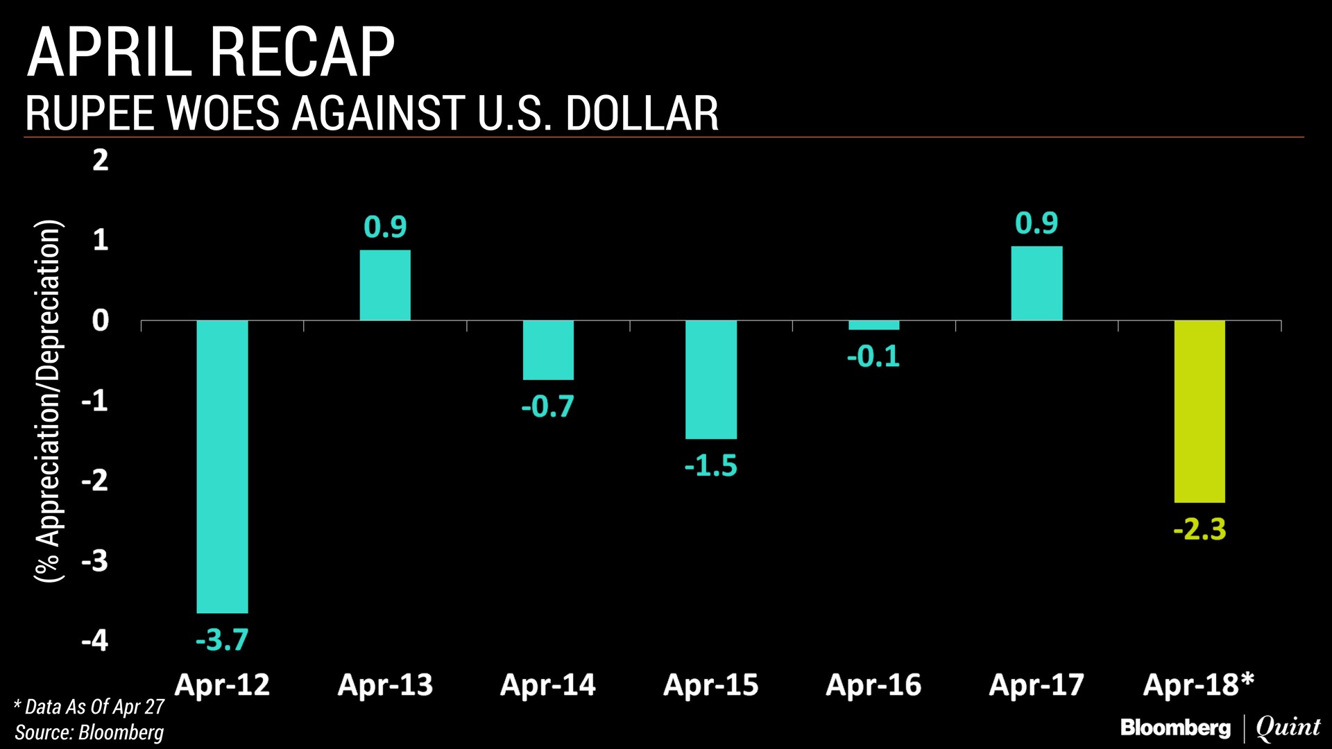 The rupee weakened for the first April in three years and depreciated the most in six years.