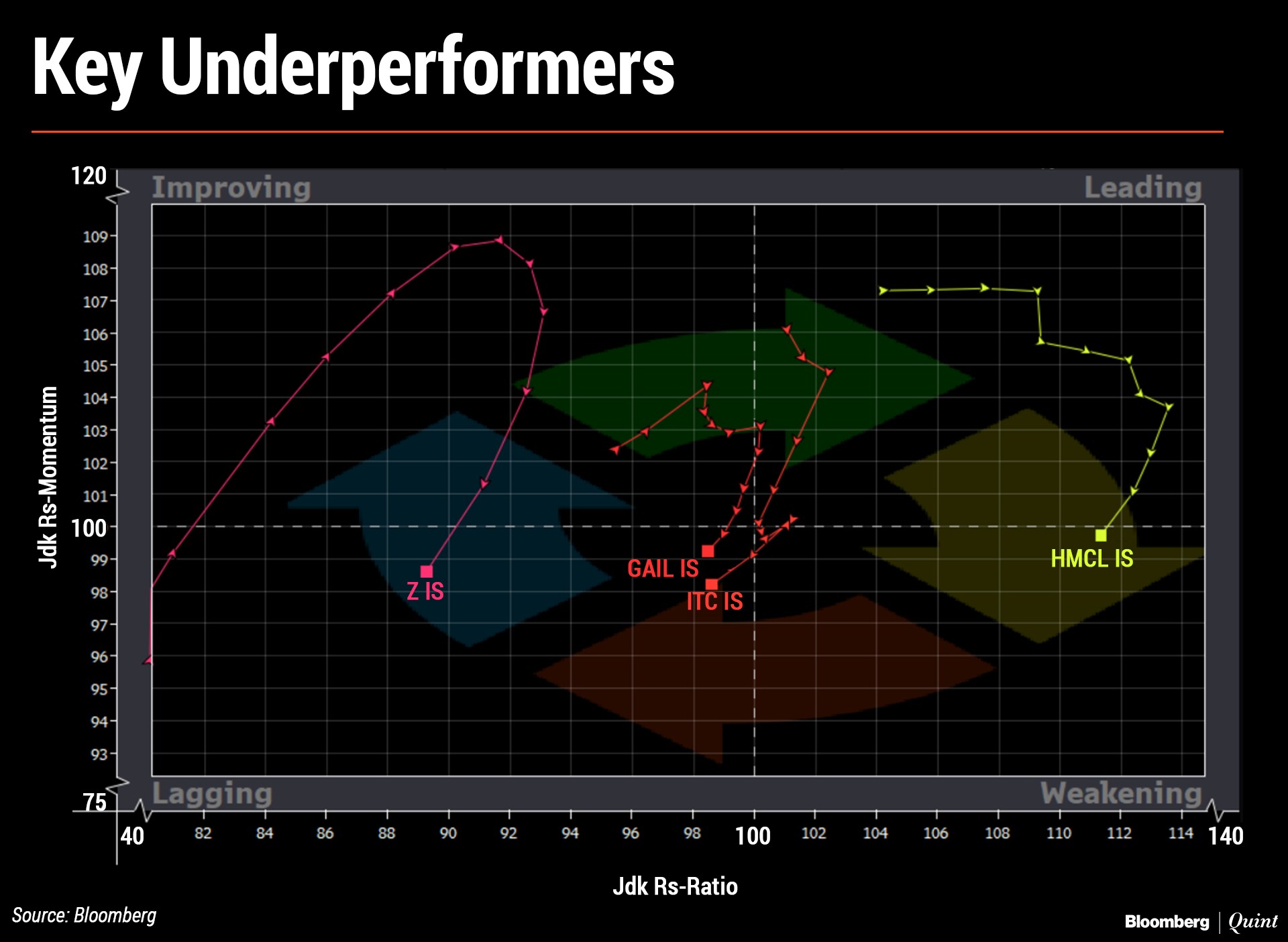 On the other hand, Hero MotoCorp Ltd., GAIL (India) Ltd., ITC Ltd. and Zee Entertainment Enterprises Ltd. could underperform compared to the Nifty 50 index. “Hero MotoCorp seems to have topped out and moved into the weakening quadrant as it steadily gives up on its relative momentum,” Vaishnav said. “Zee, GAIL and ITC have seen a sharp drop in momentum and have rotated back inside the weakening quadrant.”