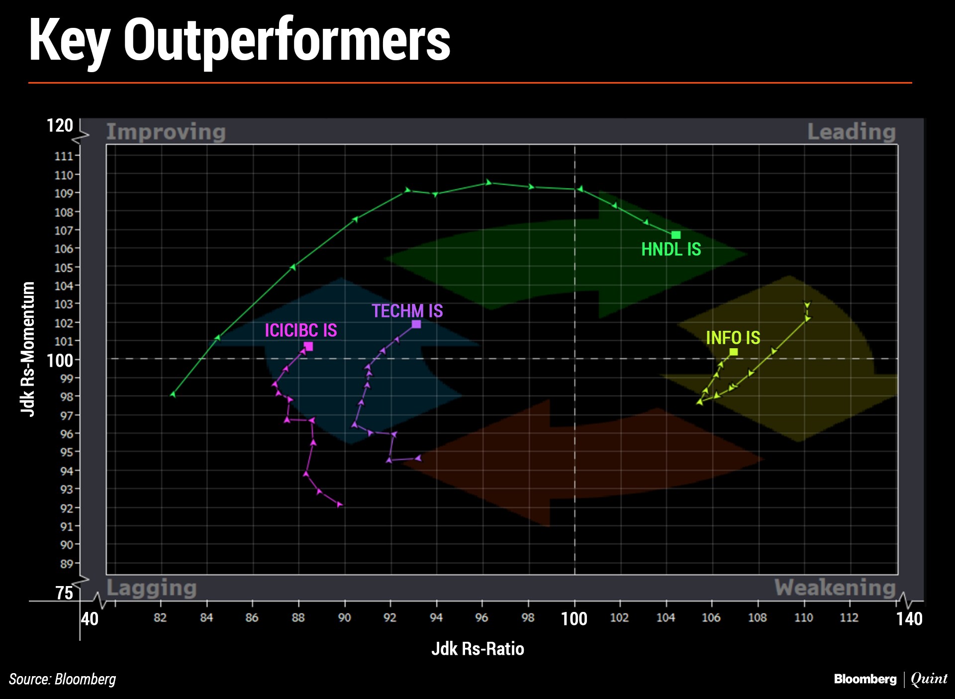 The Relative Rotation Graph, used to gauge relative strength of equities against a common benchmark and each other, suggests relative strength in IT and select Nifty 50 stocks.